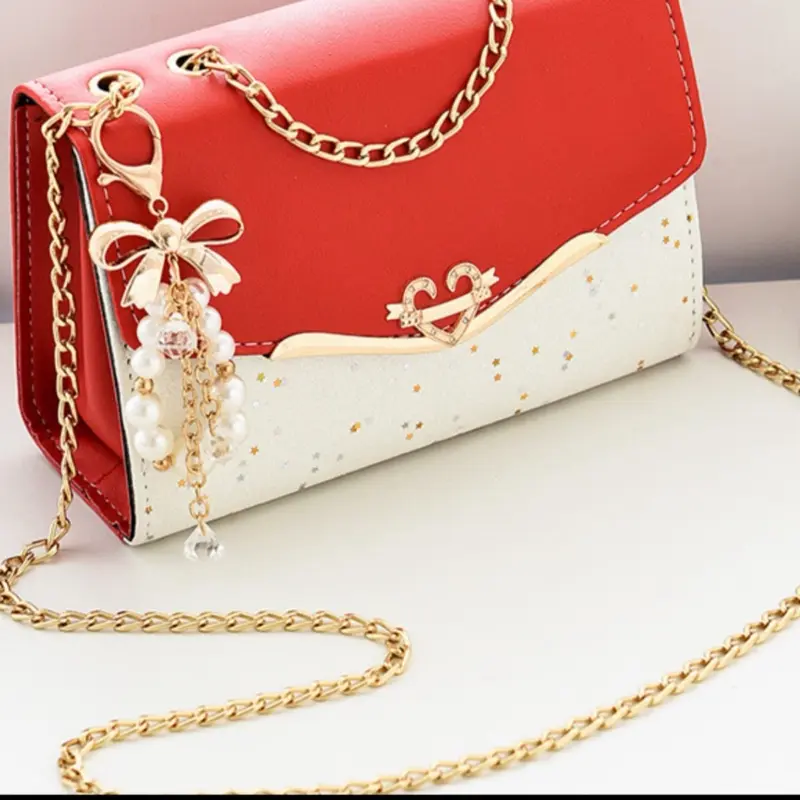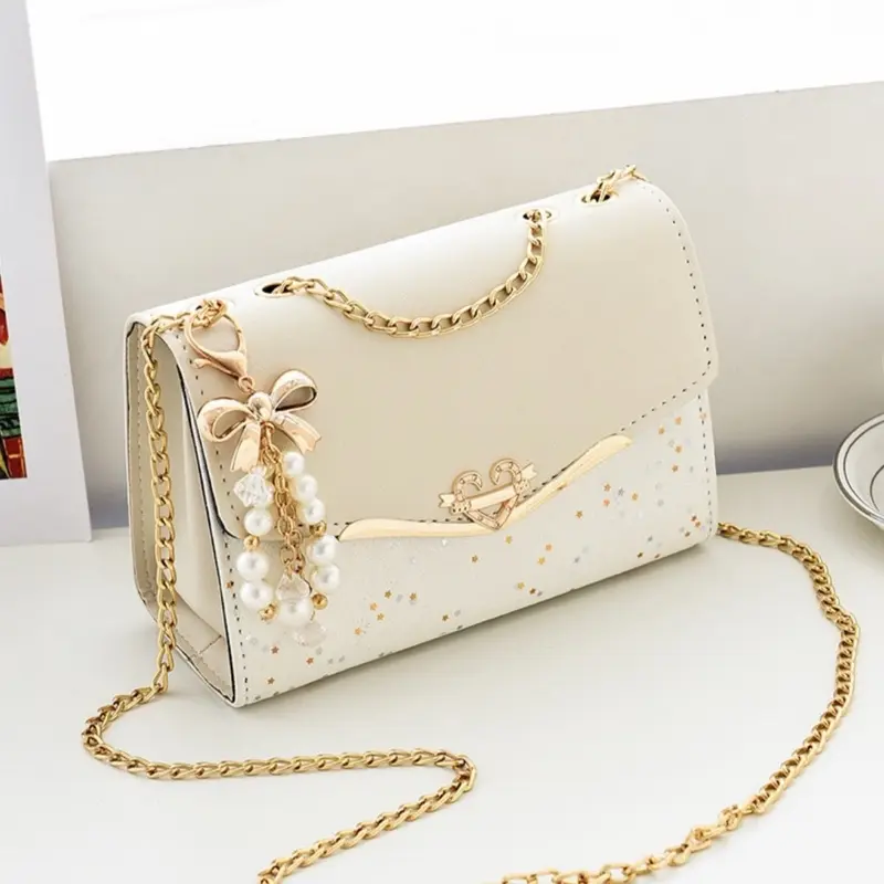 Women's PU Leather Shoulder Bag With Glitter Star Pattern Heart Metal Buckle Elegant Small Crossbody Bag For Daily Use Korean Style Handbag With Pearl Bow Pendant For Lady