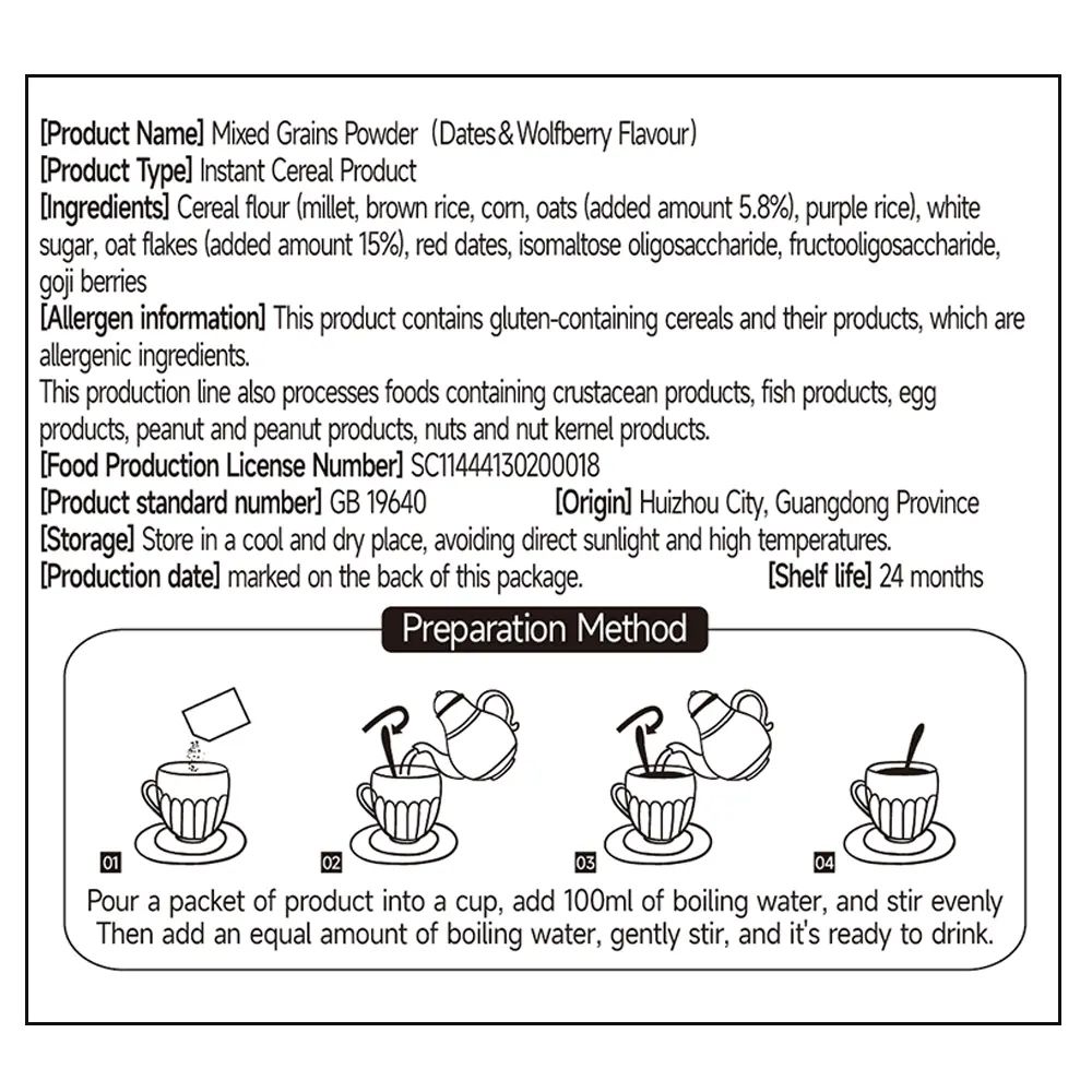 Made with selected grain ingredients including dates, oats, millet, brown rice, corn and purple rice, it is nutritious, healthy and easy to absorb.