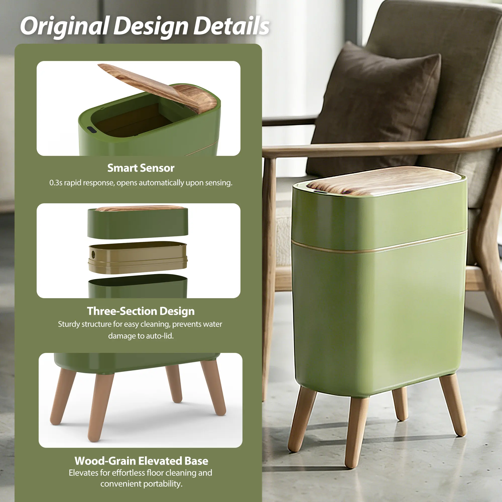 ·【NORDIC MODERN DESIGN】 - 8''L×8''W×16.3''H, 2.6 Gallons, durable ABS materials. 2 AA batteries (NOT INCLUDED). The simple appearance of this garbage can is more beautiful than the traditional trash can. The Nordic Modern design looks beautiful and clean. It is easy for guests to mistake it for a cute storage box or artwork.