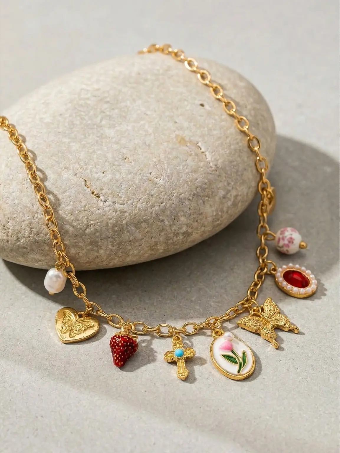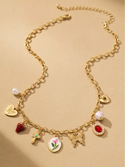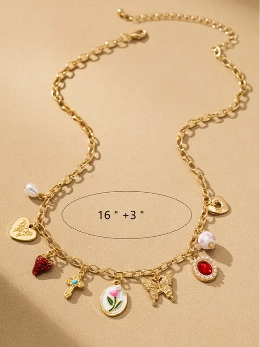 Make every outfit unforgettable with this stunning vintage-inspired charm necklace Featuring a curated mix of delicate charms—including a butterfly, floral pendant, cross, heart, and colorful gemstone accents—this piece brings a playful yet elegant vibe to your look. Each charm tells its own story, making this necklace a unique statement for any occasion.