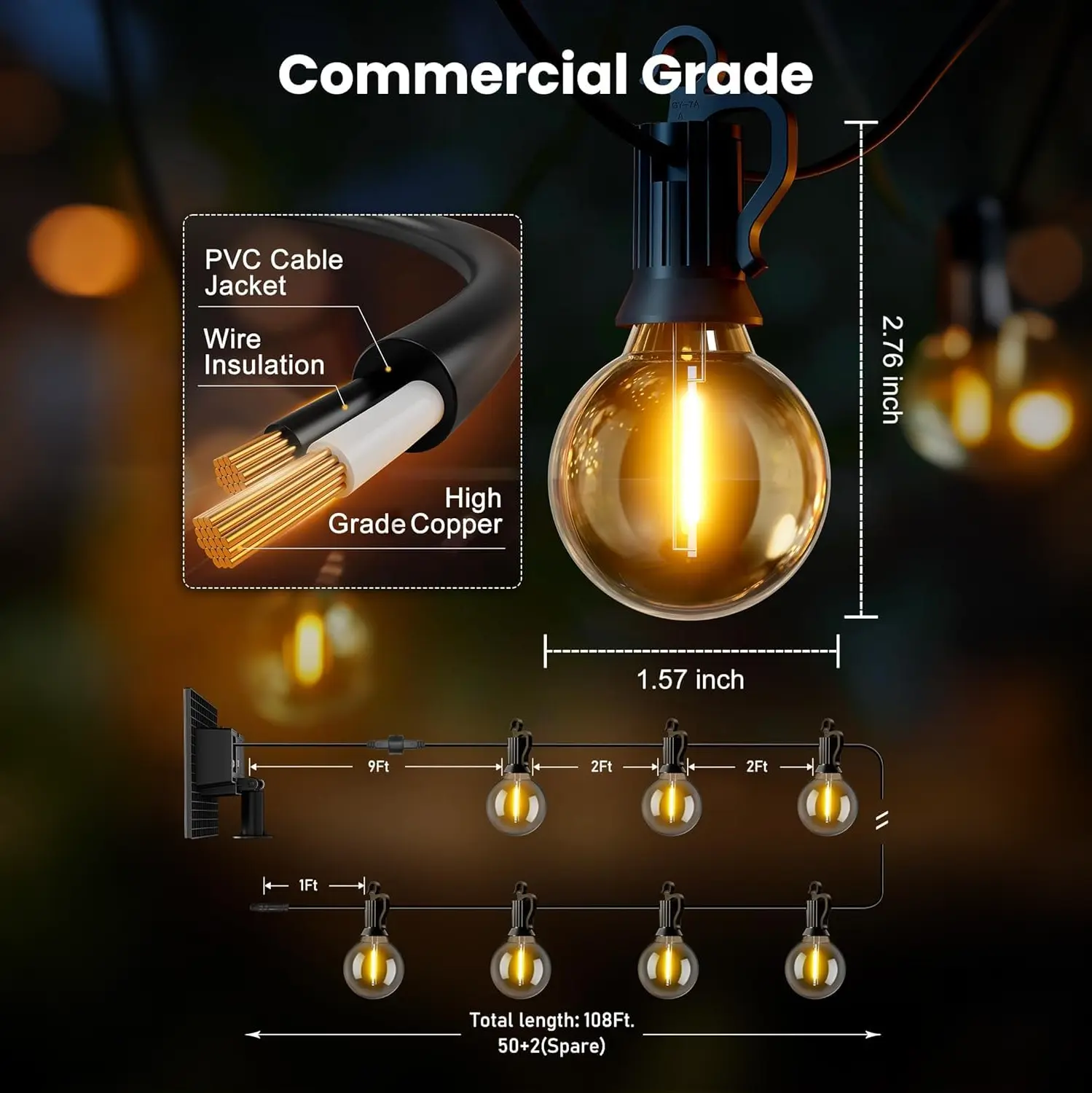108 feet solar string lights outdoor waterproof, with 2 feet spacing 50 LED Shatterproof bulbs +2 extra bulbs(0.15W LED G40 bulb with E12 candelabra base) for instant replacement and 55 pieces of cable ties for quick and secure fixing. A solar panel mounting clip is included as a bonus, allowing you to freely mount the light strings on a wall, clip them onto a fence, or insert them into the ground. Please note: The light string cannot be connected
