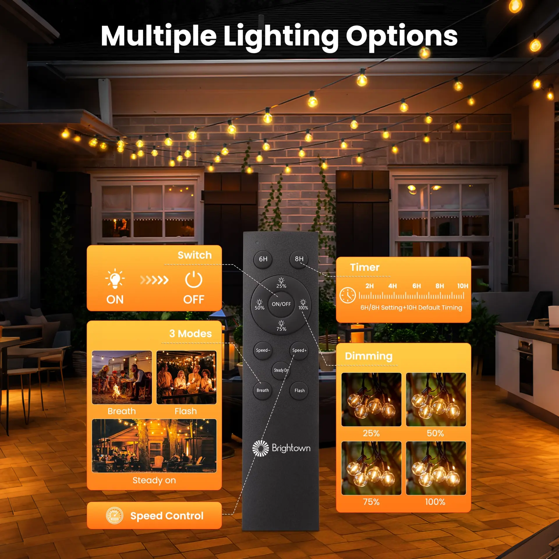 Use the included remote to adjust the brightness (25%, 50%, 75%, or 100%), choose a 6H or 8H timer (with a default 10H timer setting), and switch between 3 lighting modes of this solar powered outdoor lights: Steady on, Breathing or Flashing. These solar chistmas lights let you customize the mood without needing to buy a dimmer or install any apps.