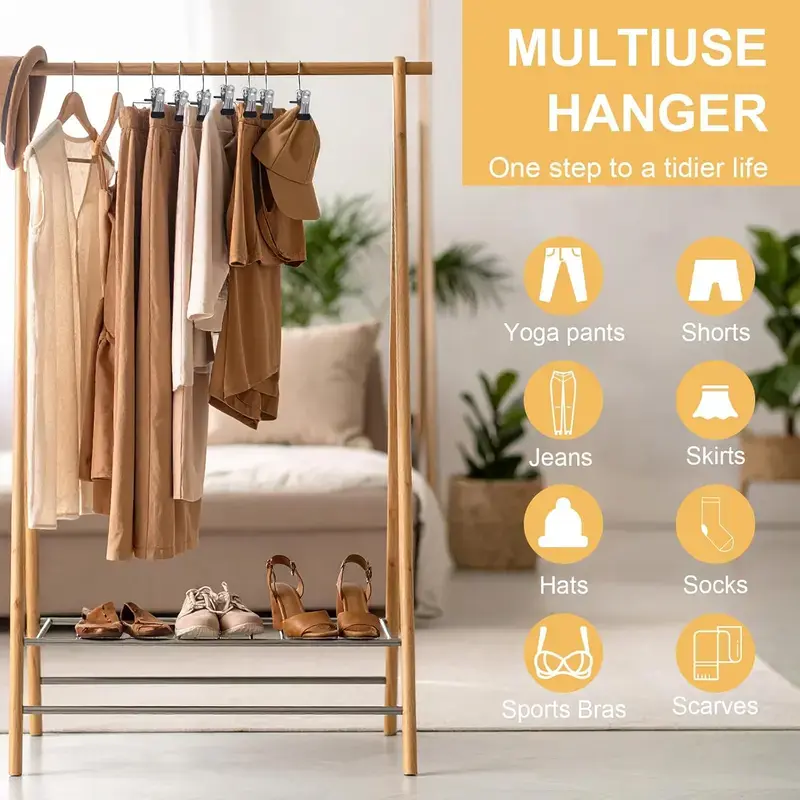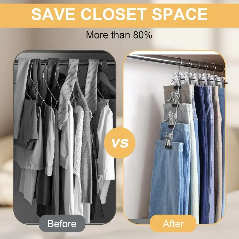 【Upgraded Design】- The innovative 360° rotate design of the pants hangers with clips allows effortless access to your footwear; the large aperture hook are easier for and organizing items efficiently; the highly elastic spring of the legging organizer ensures a secure grip, keeping your items organized and accessible; these hook clip hangers for pants protect both your clothes and hands from and won't leave any mark, ensuring your belongings stay in pristine condition.