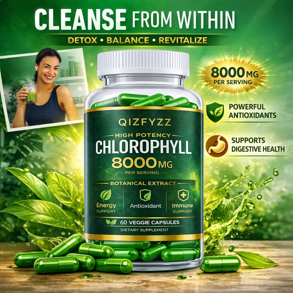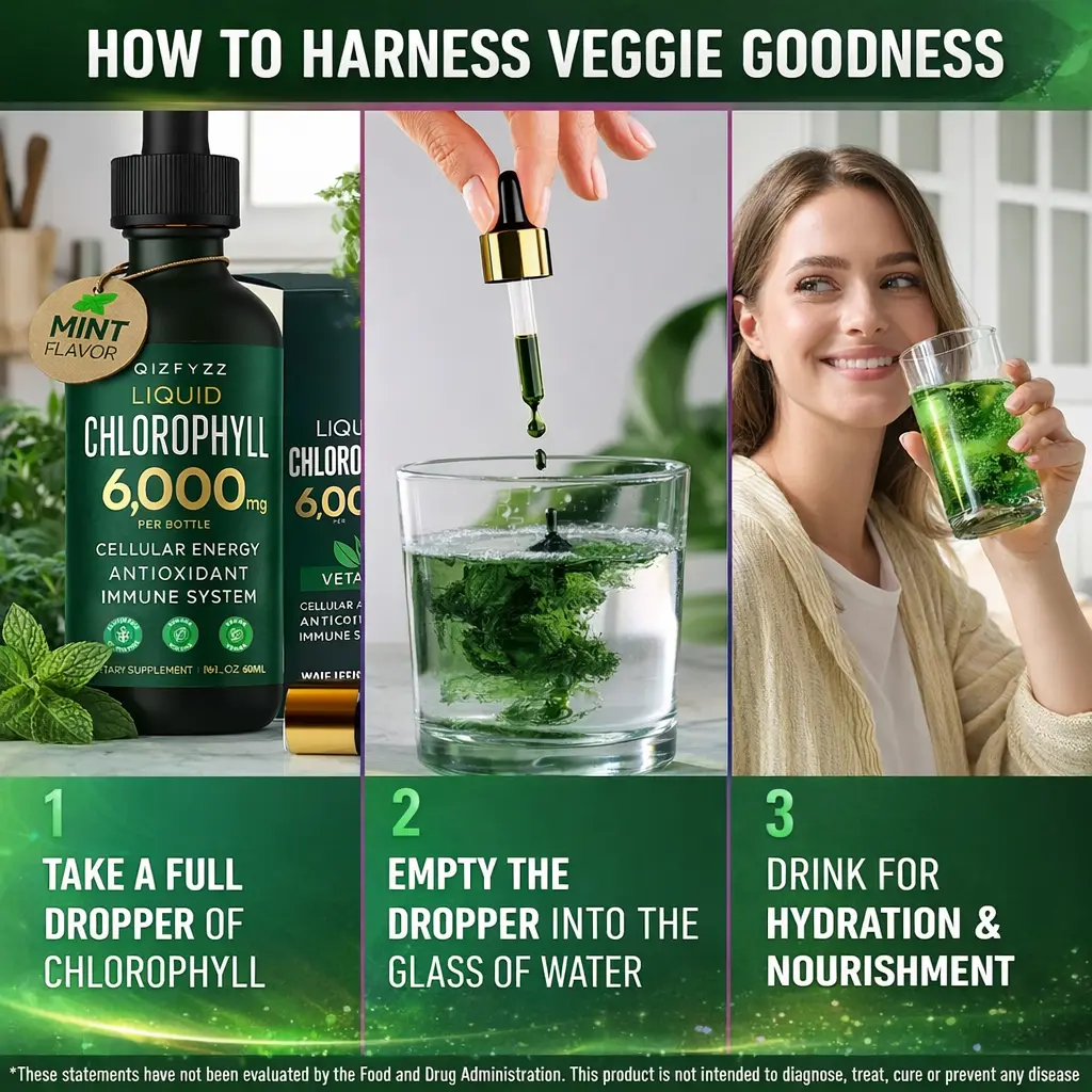 QIZFYZZ offers high potency liquid chlorophyll at 6000mg and capsules at 8000mg. Perfect for detox, antioxidants, cellular energy, and immune support. Enjoy a mint flavor that enhances your experience. Vegan and non-GMO, it's a guilt-free choice. Each pack includes 2 fl oz of liquid and 60 veggie capsules. Ideal for those seeking natural health benefits.
