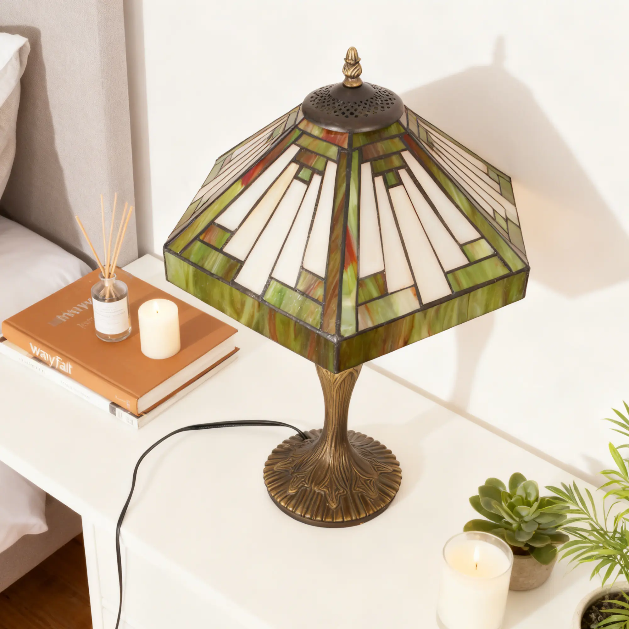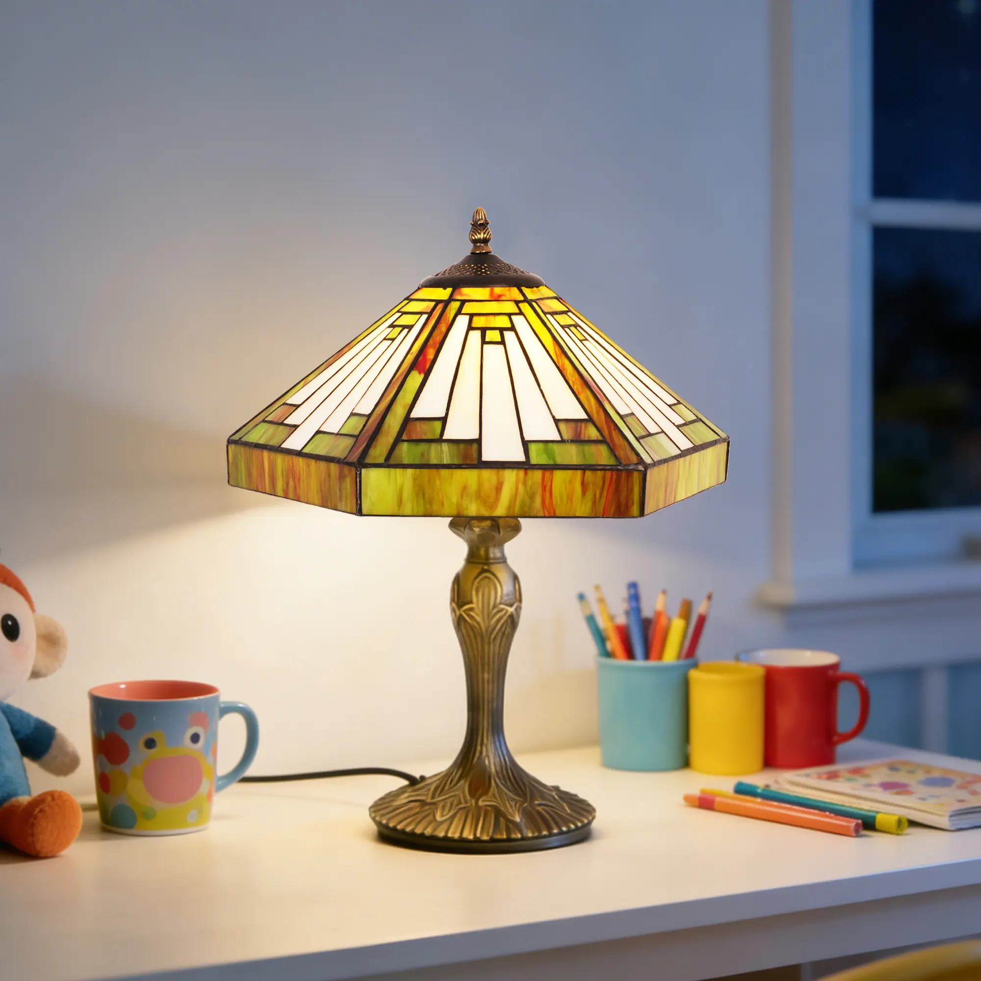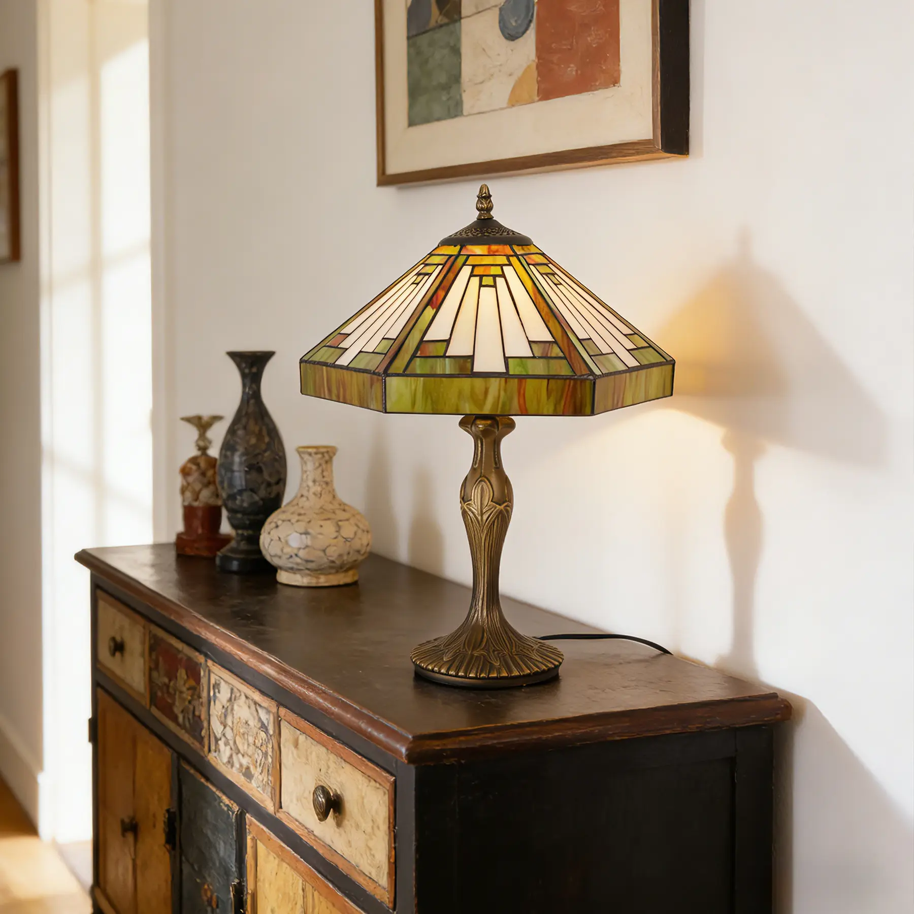 Crafted with high-quality stained glass in a geometric mission pattern, this table lamp features the iconic Tiffany aesthetic. When lit, the colored glass casts a stunning warm glow, turning your desk or nightstand into a work of art. The vintage bronze finish adds a timeless retro touch to any interior style.