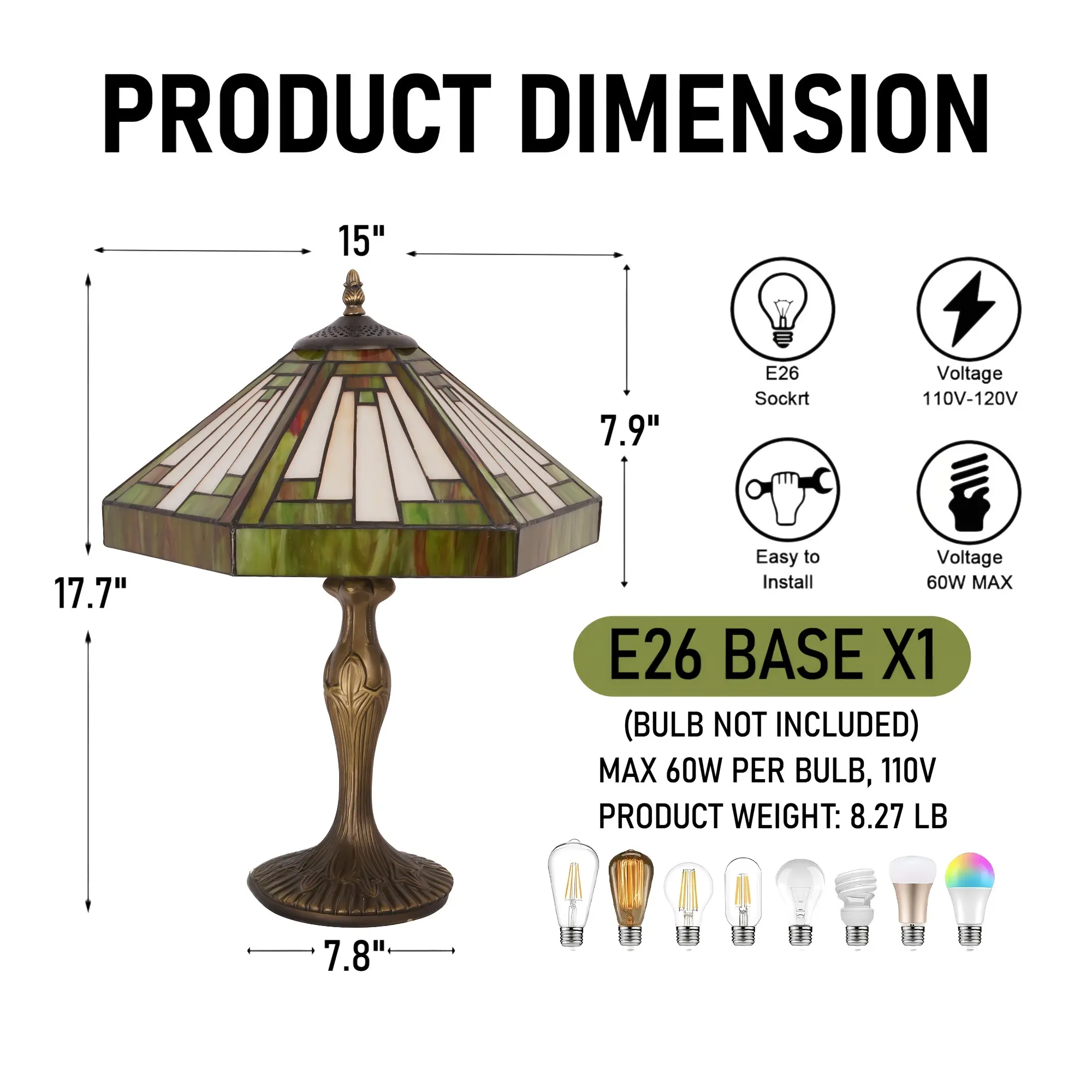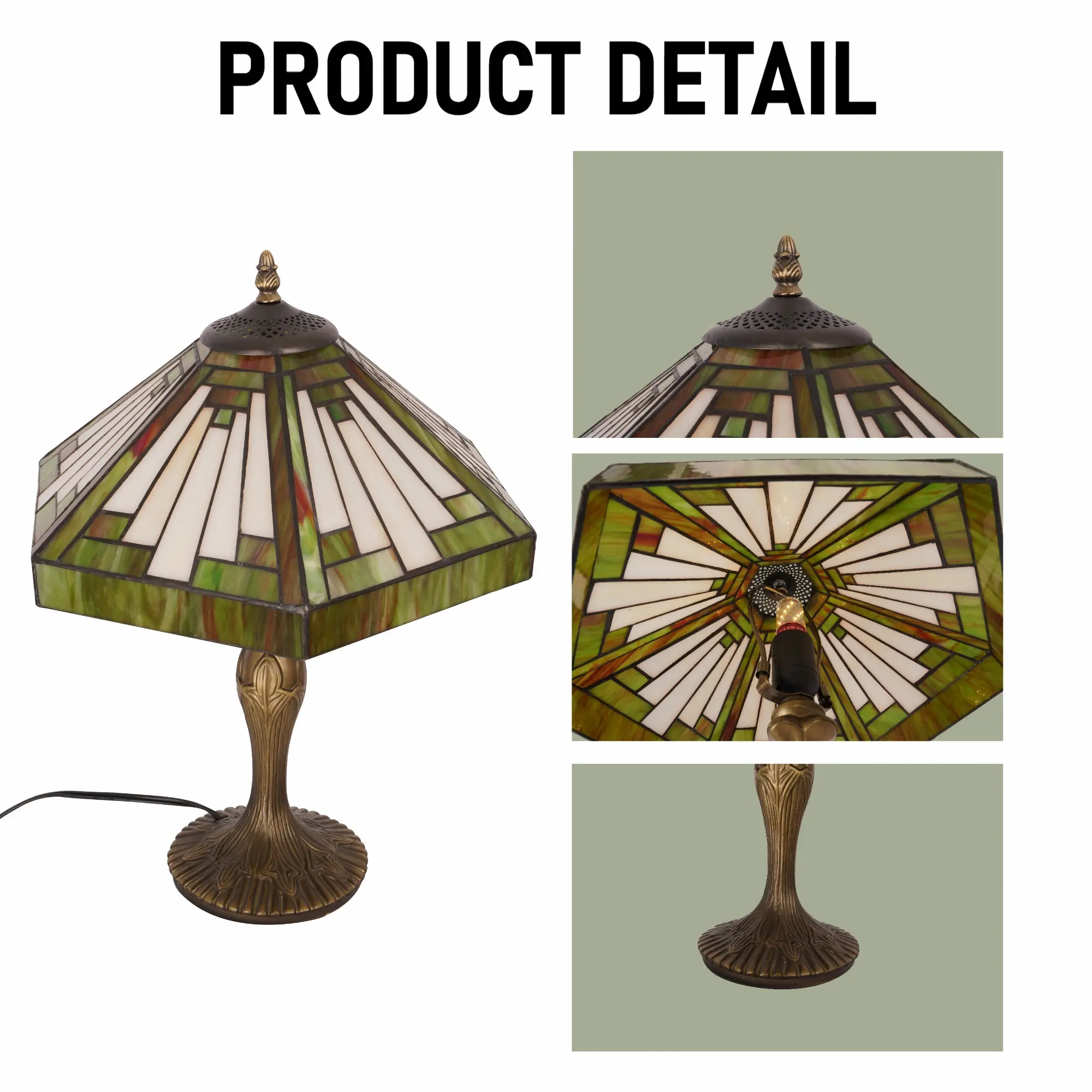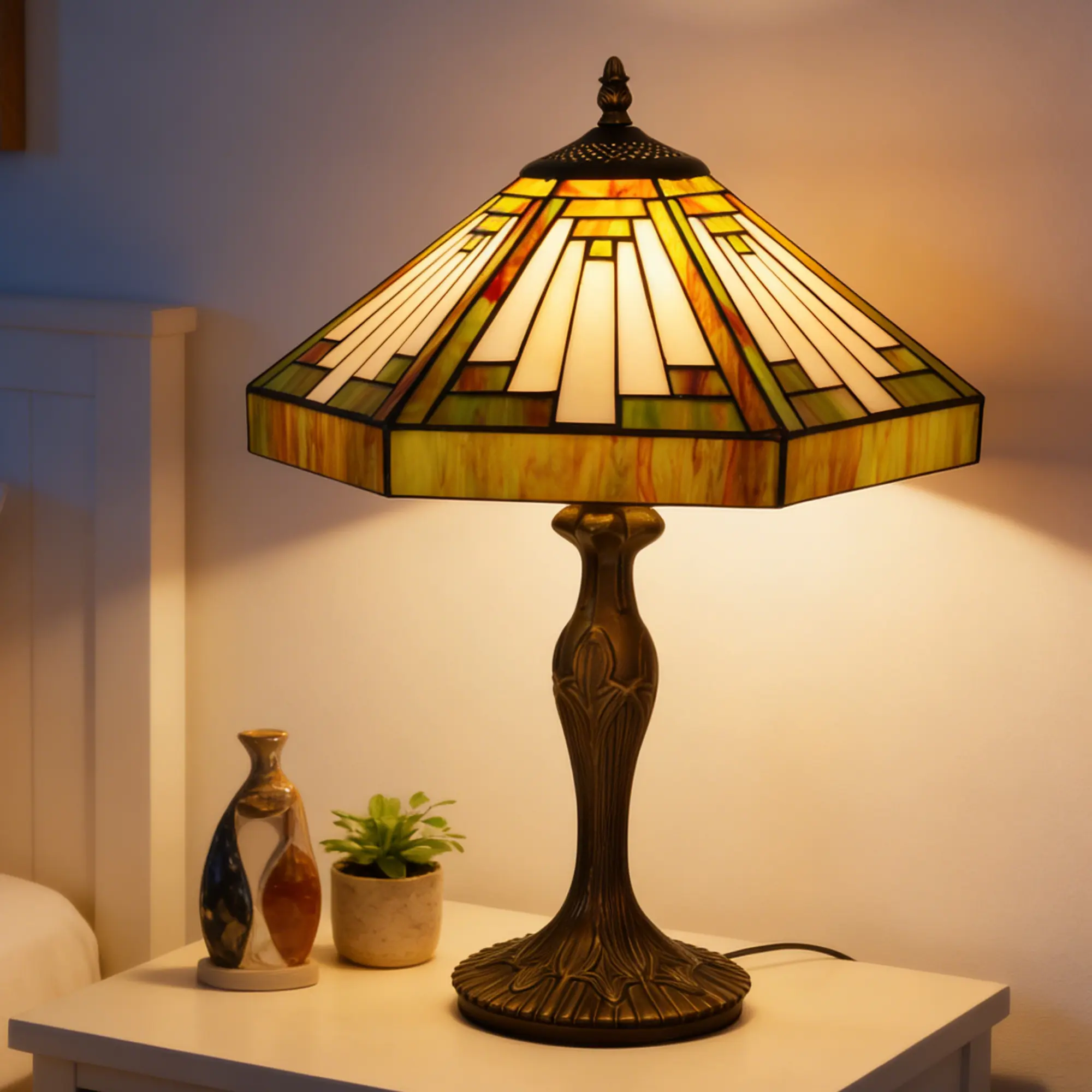 Crafted with high-quality stained glass in a geometric mission pattern, this table lamp features the iconic Tiffany aesthetic. When lit, the colored glass casts a stunning warm glow, turning your desk or nightstand into a work of art. The vintage bronze finish adds a timeless retro touch to any interior style.