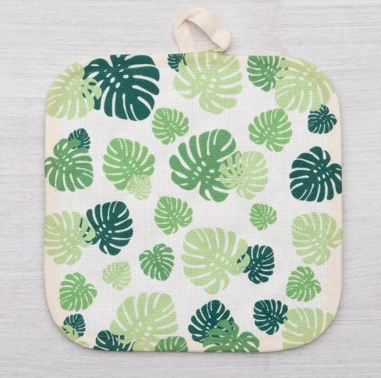 This tropical leaf pot holder set combines style and function—perfect for protecting your hands while cooking or baking, while also doubling as cute kitchen decor.