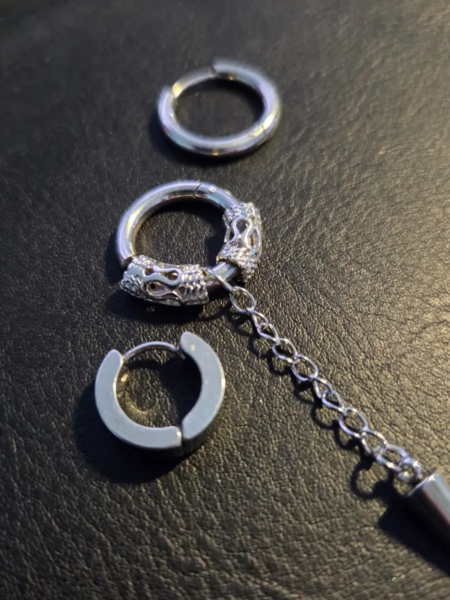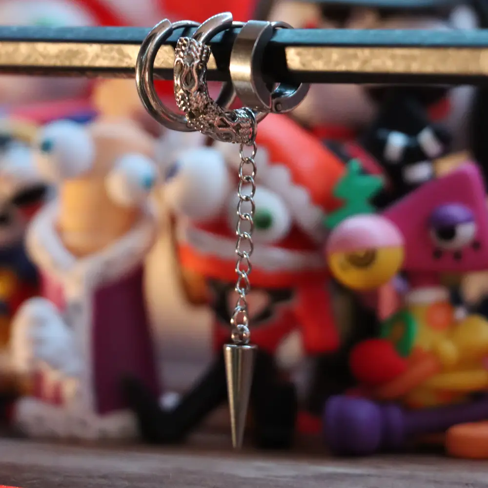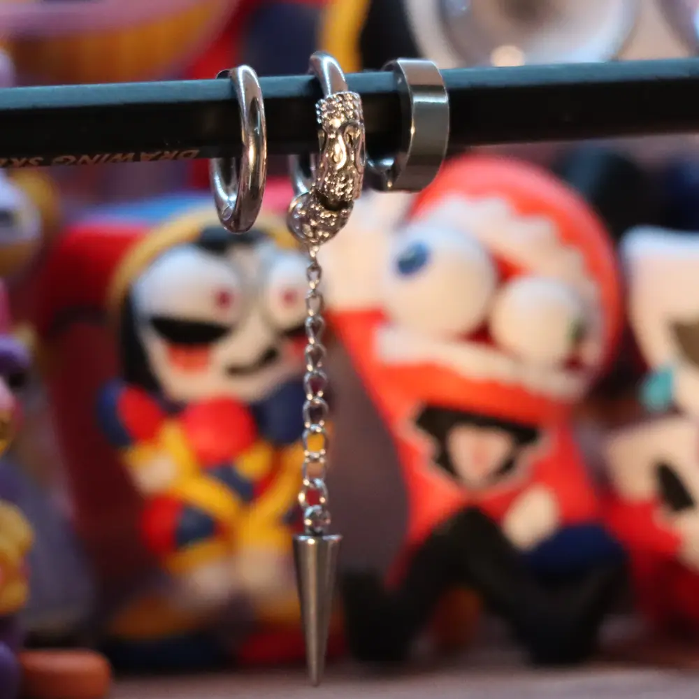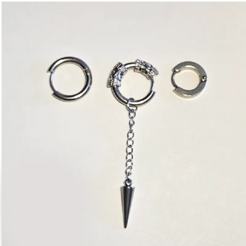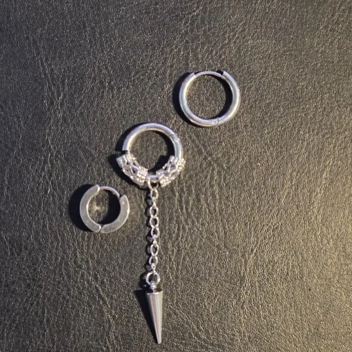 A modern 3‑piece earring set designed for a clean, masculine and edgy look. Includes two minimal hoops and one statement hoop with a chain and spike pendant. Lightweight, comfortable and perfect for daily wear or stacking with other accessories. A simple but bold set that elevates any outfit.