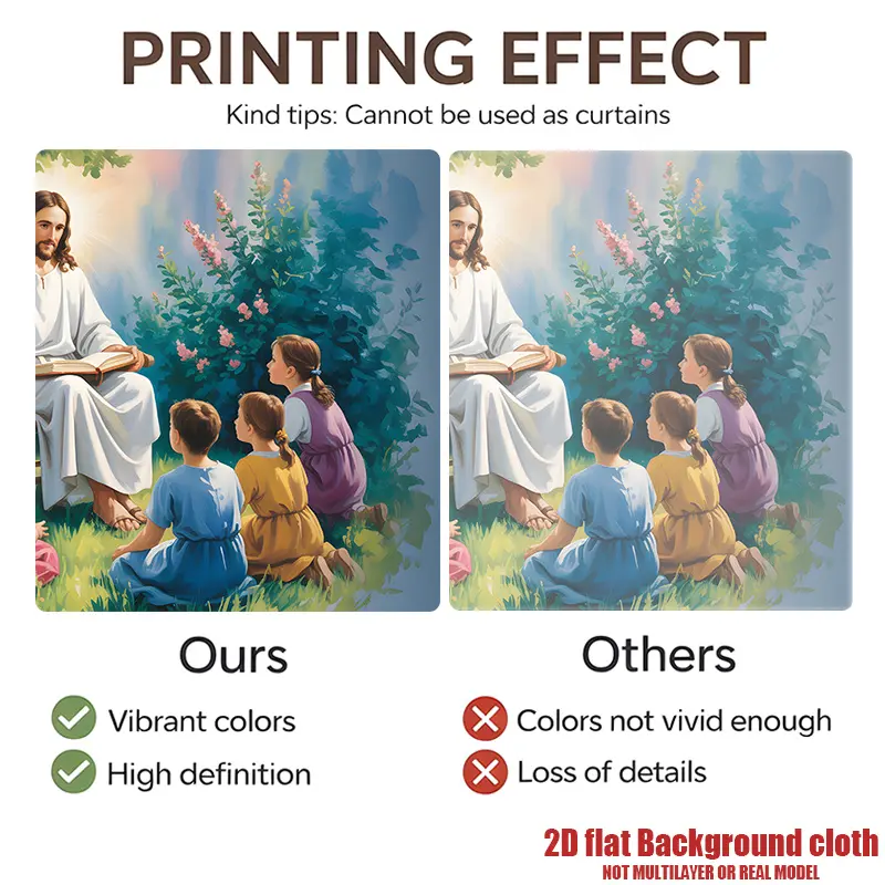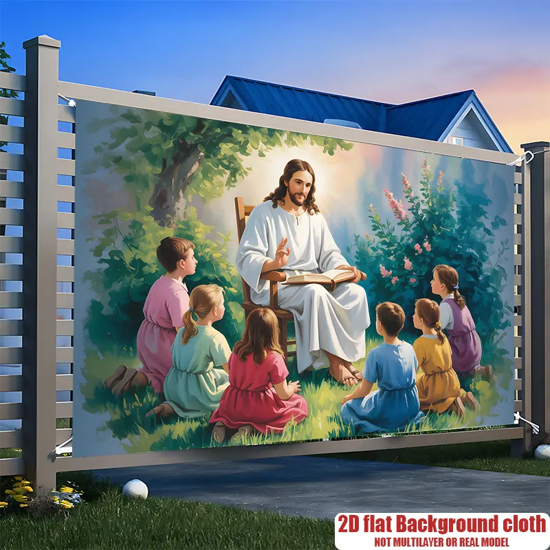 ·2D Flat Banner: This religious banner features Jesus and children, perfect for garden or home decor. It's a multicolor decoration ideal for church parties and events. Made from polyester fabric, it's a versatile decorative signage option.