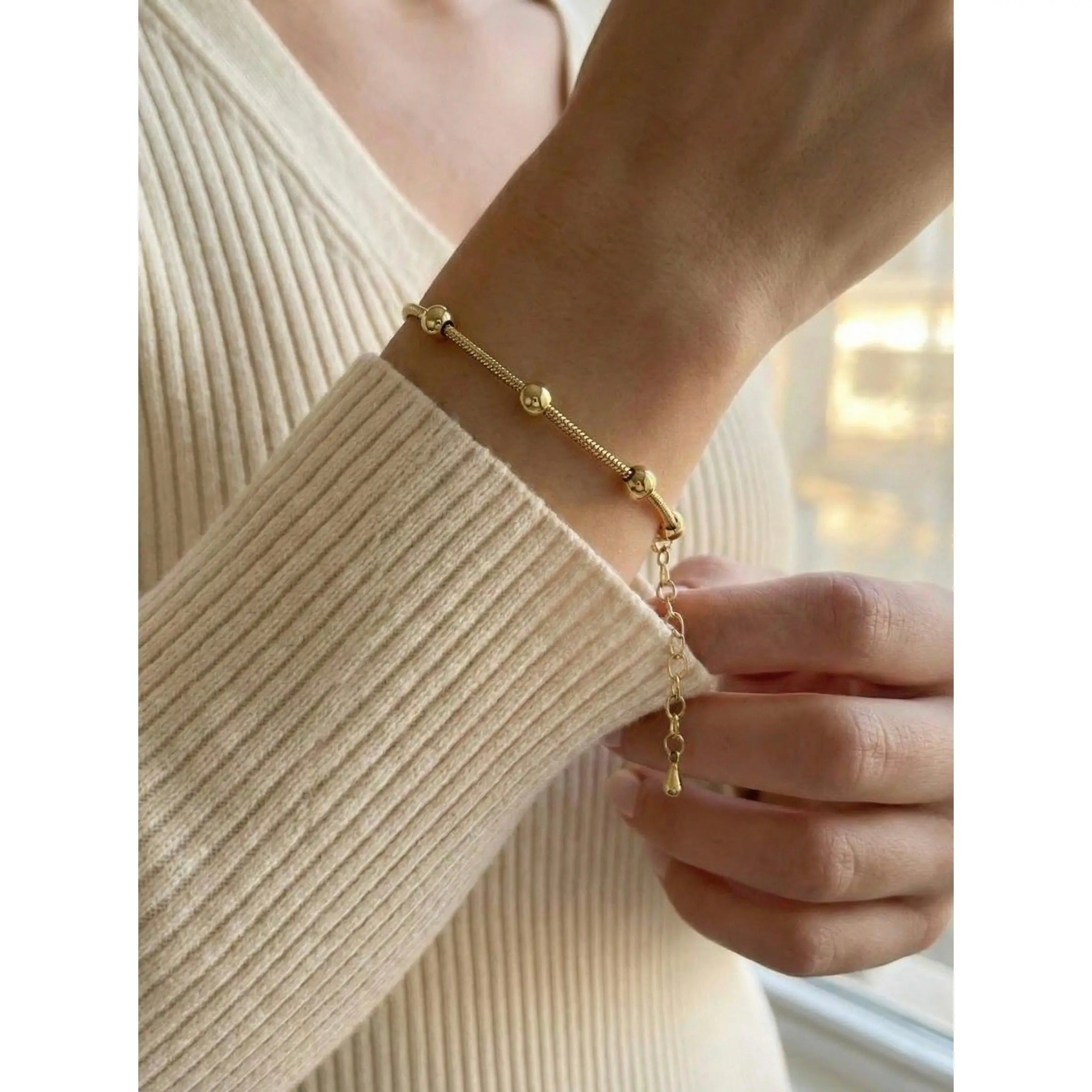 The Golden Orbit features polished bead stations spaced along a sleek snake chain, creating soft movement and subtle shine with every turn of your wrist. Designed for everyday wear, this piece layers effortlessly or stands on its own for a clean, modern look. Adjustable for the perfect fit and finished with a secure lobster clasp.