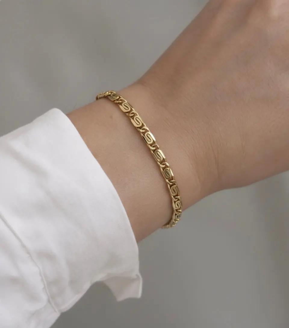A statement chain with subtle detail. The Signature S-Link Bracelet features polished gold links accented with sculpted S-shaped insets, giving it a sleek, architectural look that stands out on its own.