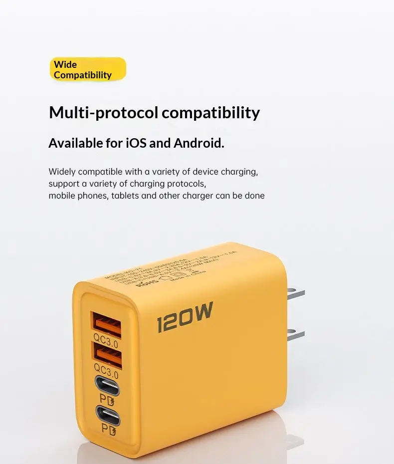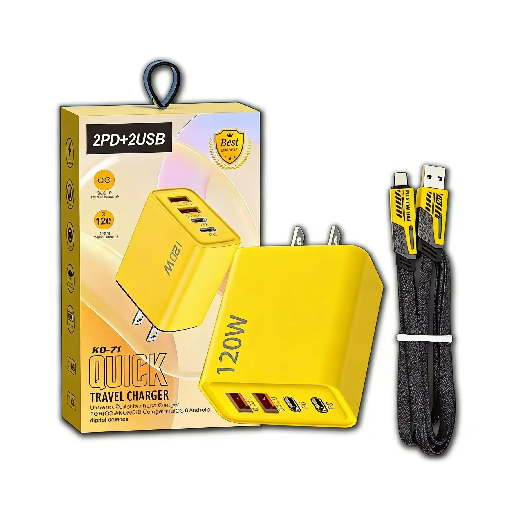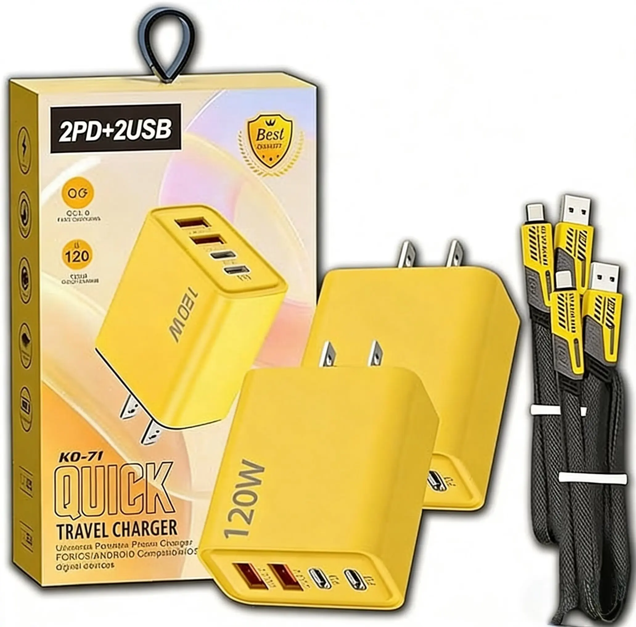5. 2 PCS Portable Fast Charger, Type C/USB A Dual Ports Adapter, 4 in 1 Fast Charging Cable & Data Sync, 120w Fast Chargers, 1.5m Flat Braided, for iPhone, Ipad, and Airpods