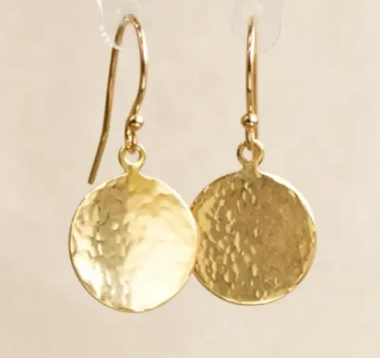 These hammered gold disc dangle earrings are designed for effortless everyday style. The hand-hammered texture creates a soft, reflective finish that complements any outfit. Lightweight and comfortable to wear all day, these earrings work for casual looks, workwear, and special occasions alike. A simple yet elegant addition to any jewelry collection.