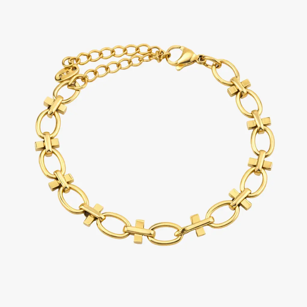 The Valencia Link Bracelet features oversized oval links with modern bar detailing, creating a look that feels polished but intentional. It’s the kind of piece that stands on its own yet layers effortlessly with your everyday favorites.