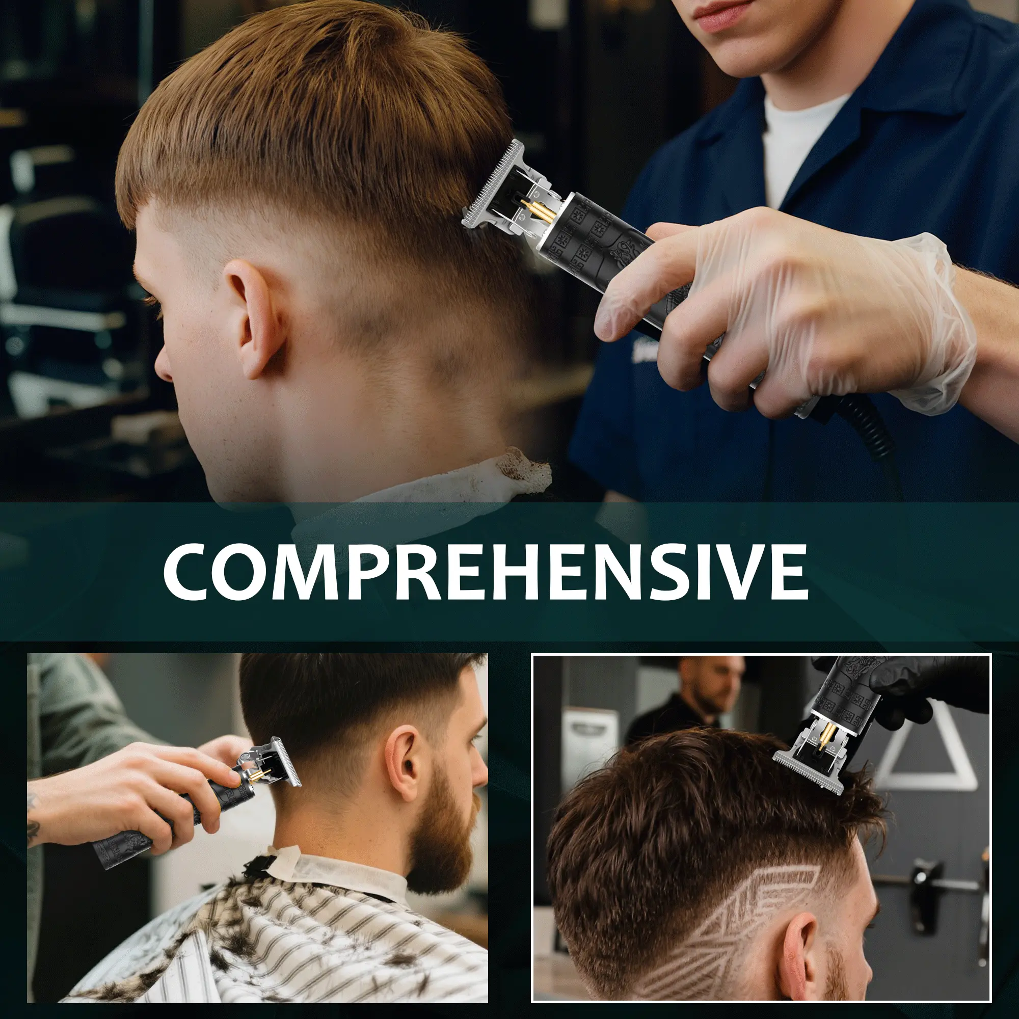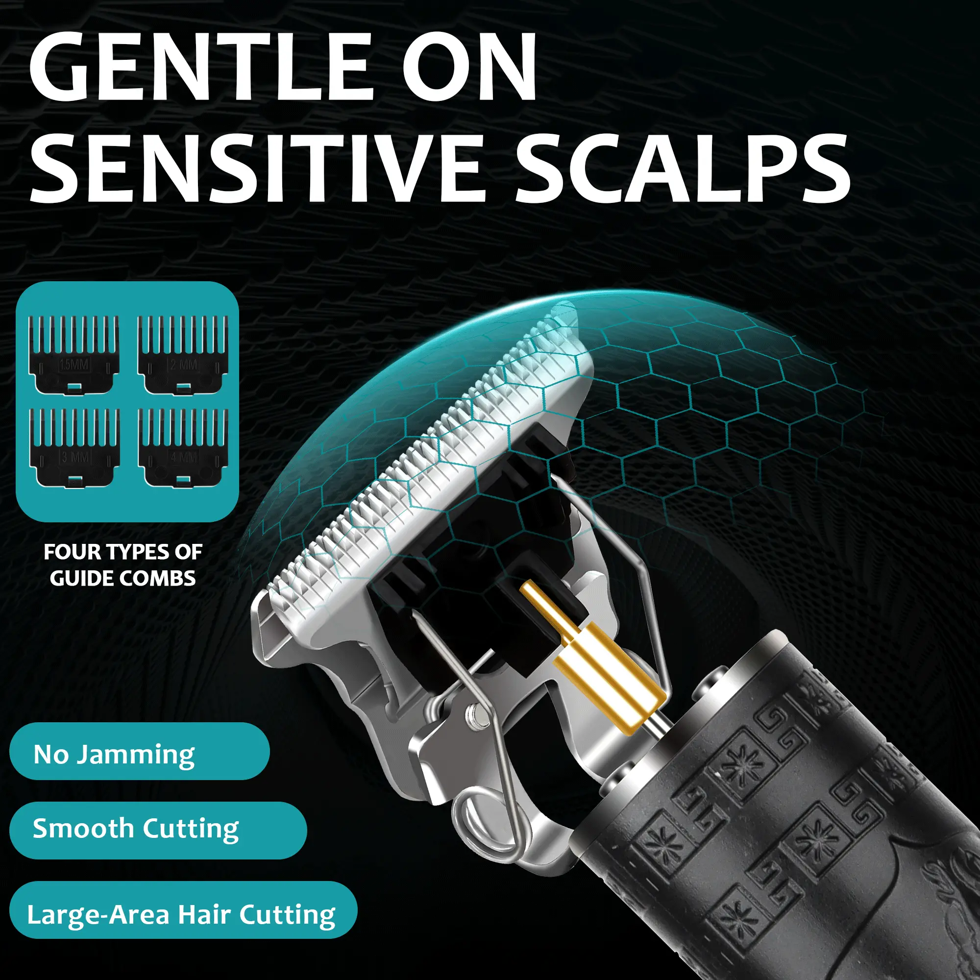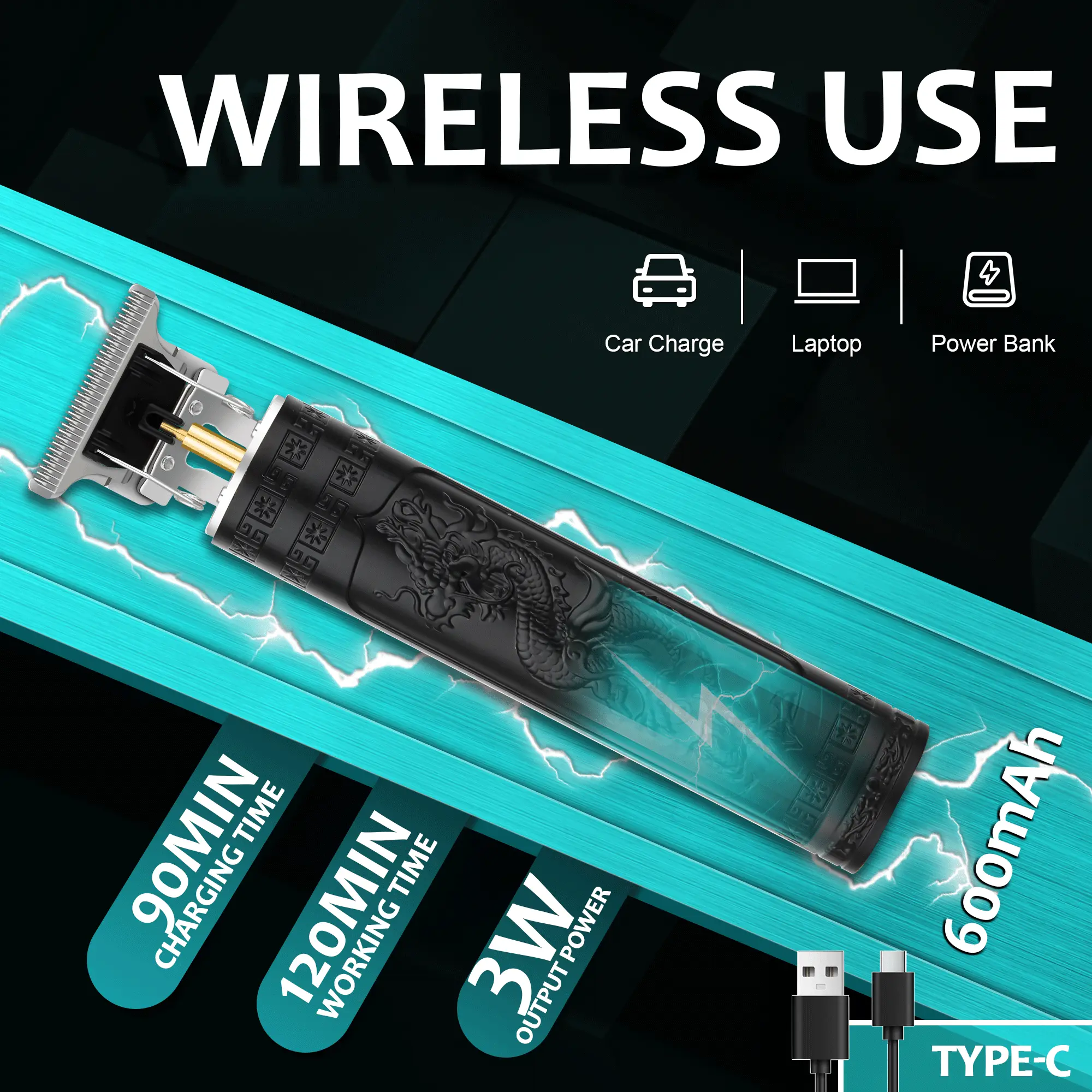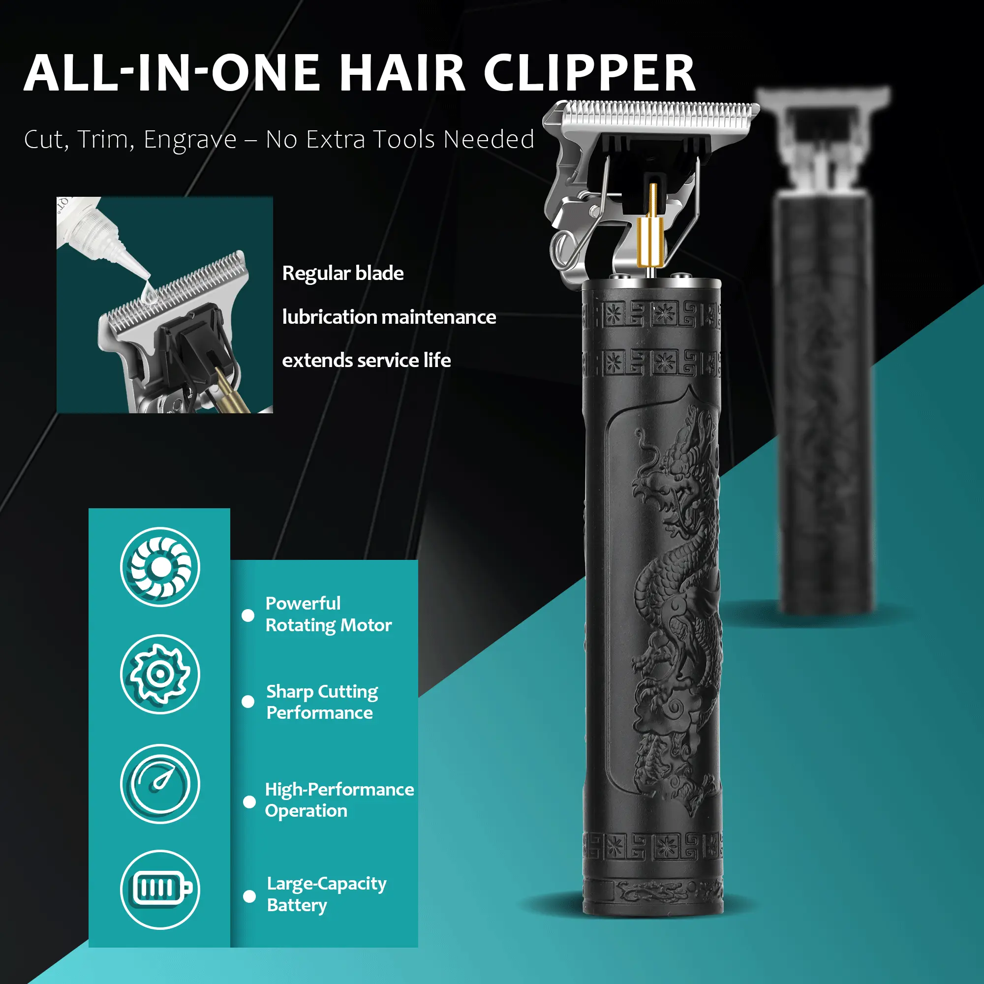 This premium cordless trimmer features a striking vintage dragon-engraved design, paired with a sharp close-cut T-blade for precise haircuts, fades, edges, and beard shaping.