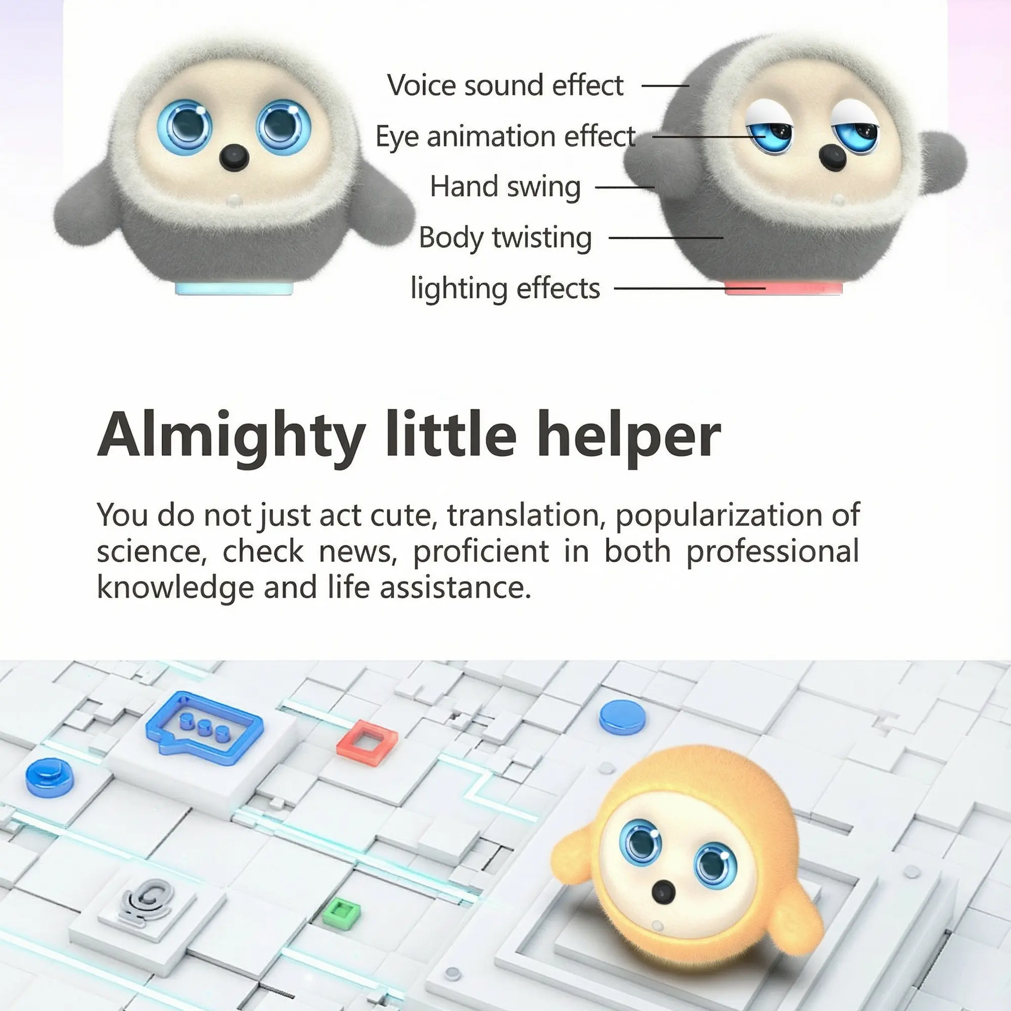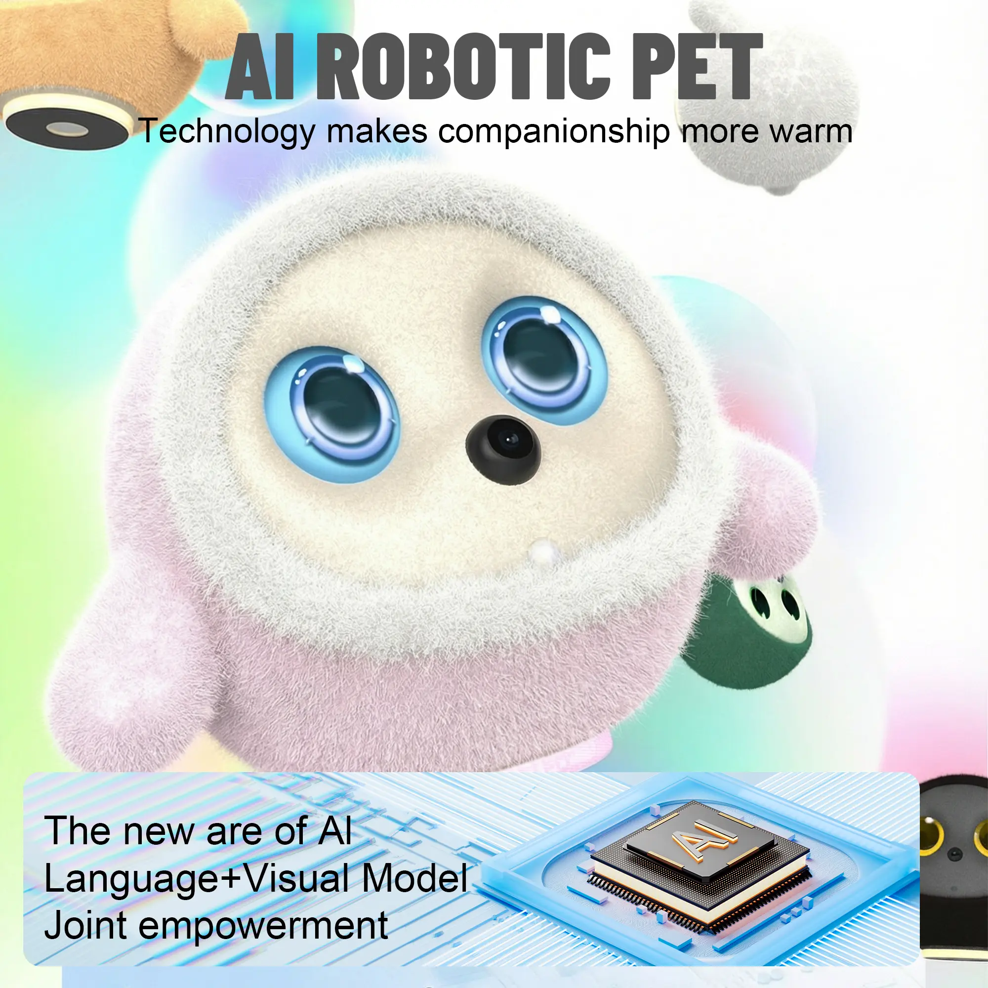 Introducing the AI Robotic Pet, a smart desktop companion with LLM & VLM Vision. This robot offers voice conversation and touch sensors for interactive experiences. Perfect for home and office use, it provides a unique emotional connection. Customize it with plush covers to match your style.