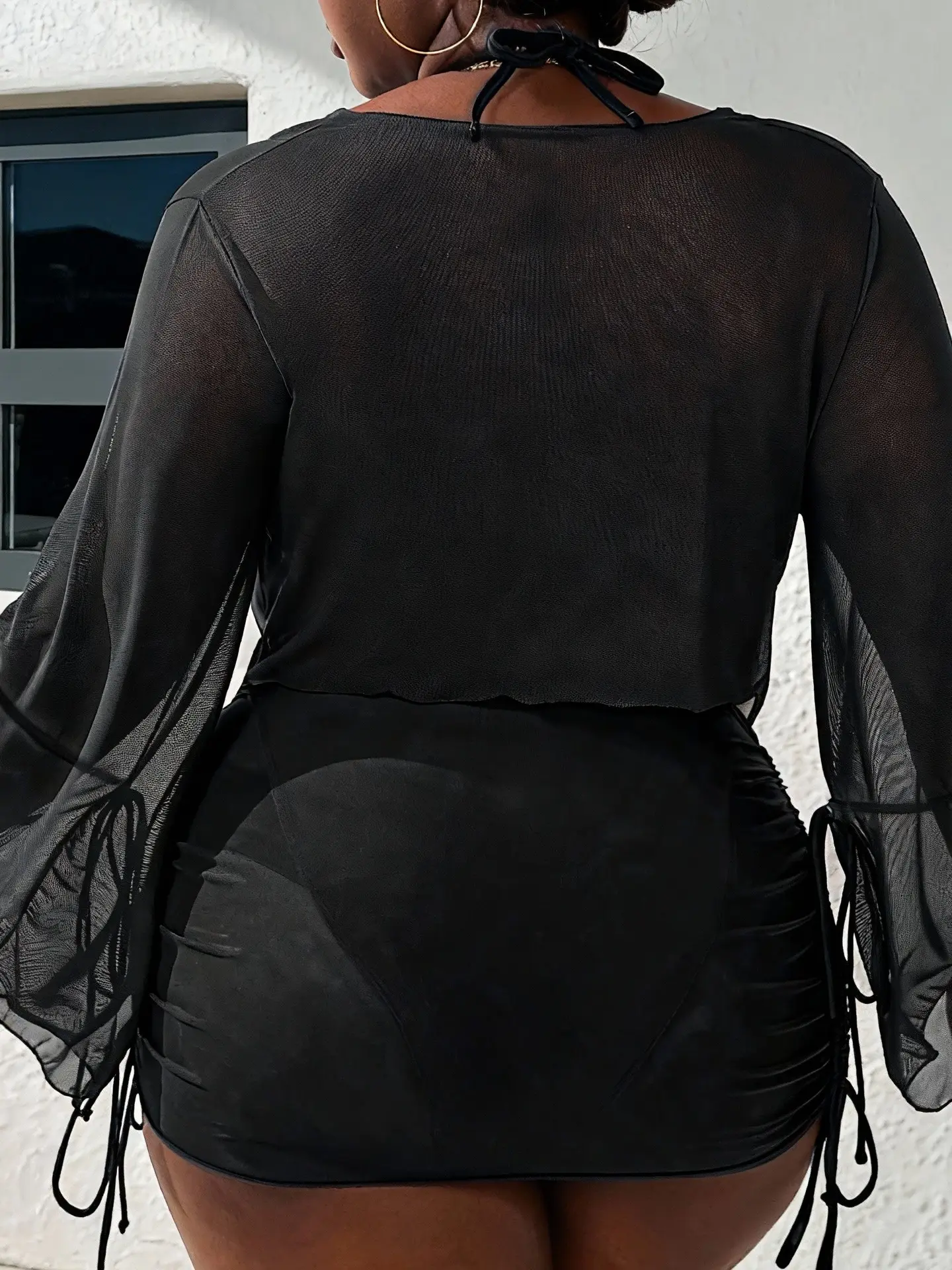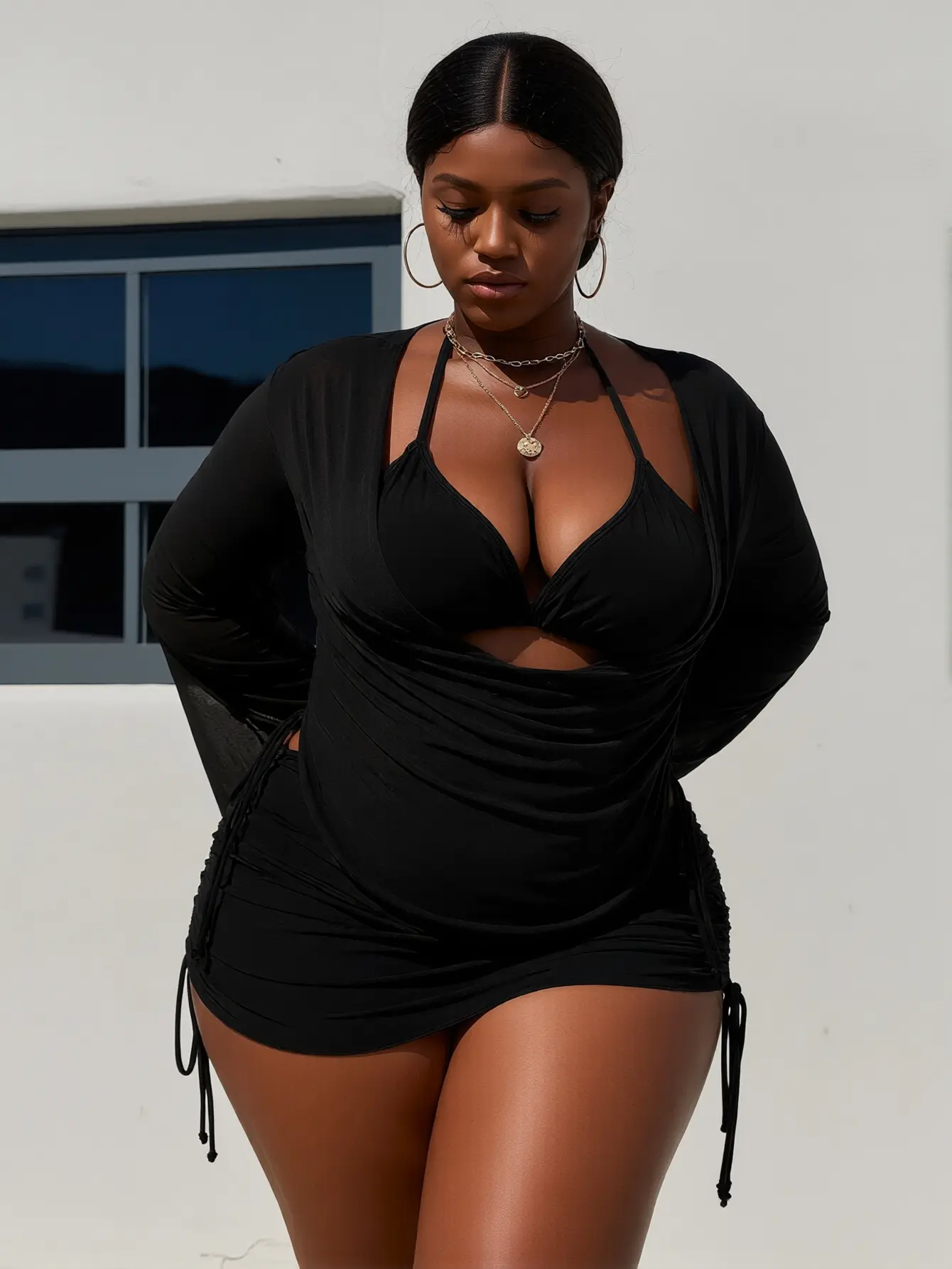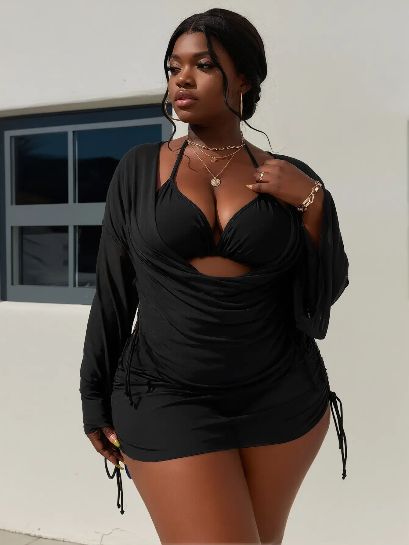 Elevate your curvy swimwear collection with our Plus Size 4-Piece Black Halter Bikini Set with Bell Sleeve Cover Up, designed exclusively for curvy women who want to embrace their curves with confidence and style. This complete 4-in-1 set includes a supportive halter bikini top with removable padding, high-waisted tummy-control bottoms, a ruched drawstring mini skirt, and a flowy bell-sleeve sheer cover-up. Crafted from premium high-stretch fabric, it delivers a flattering, comfortable fit perfect for beach days, pool parties, and tropical getaways.