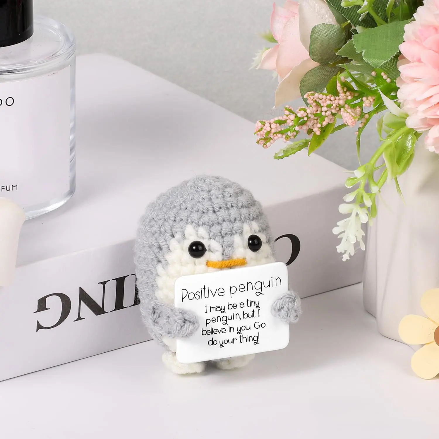 5. Positive Penguin Decorative Ornament, 1/8 Counts Funny Knitted Penguin Ornament with Positive Card, Cute Positive Penguin Crochet Decorative Ornament