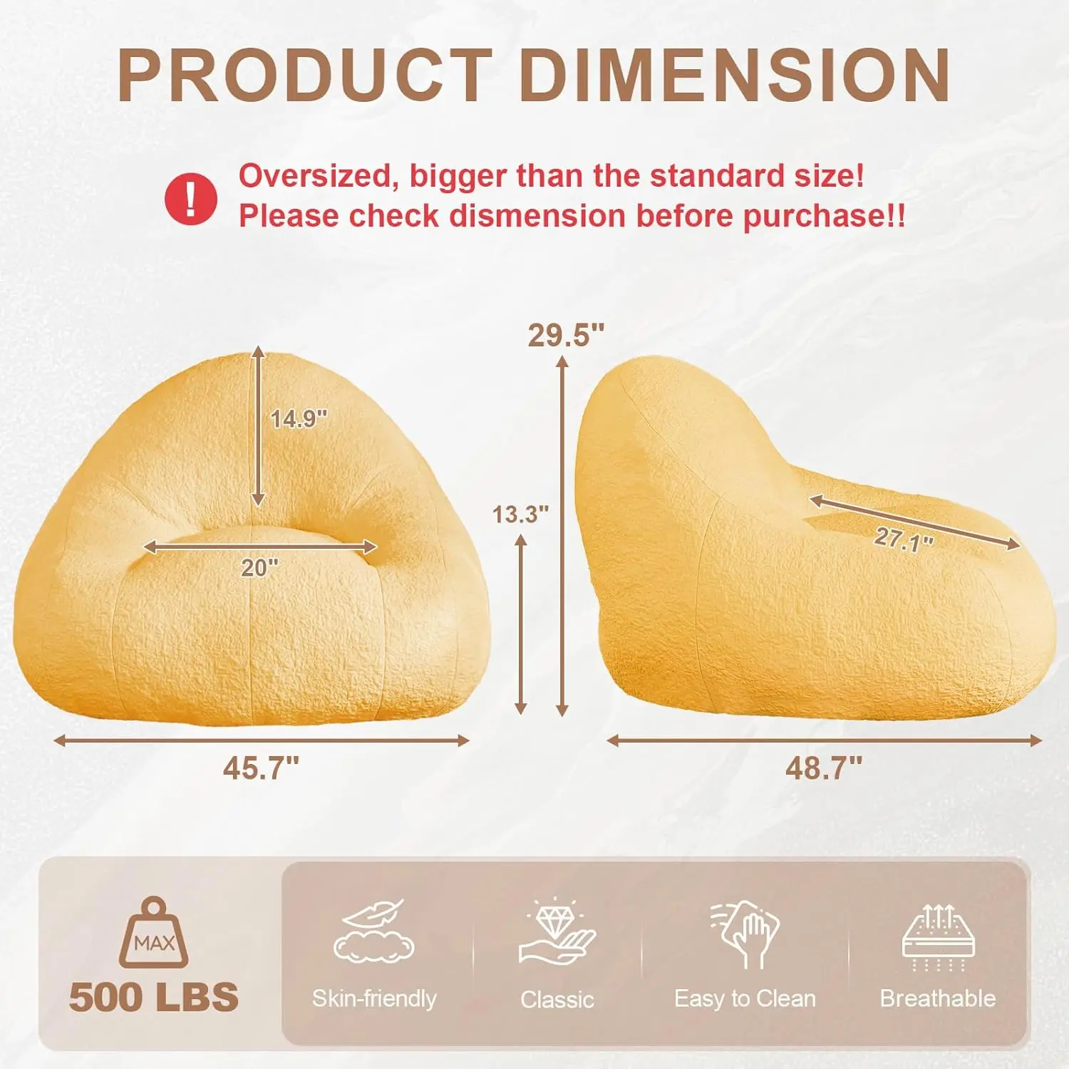 Stylish & Pet-Friendly: With a modern minimalist design and generous sizing (48.7"D x 45.7"W x 29.5"H), this big bean bag chair complements any home decor. Its durable fabric is loved by pets, offering a cozy spot for your furry friends to relax.