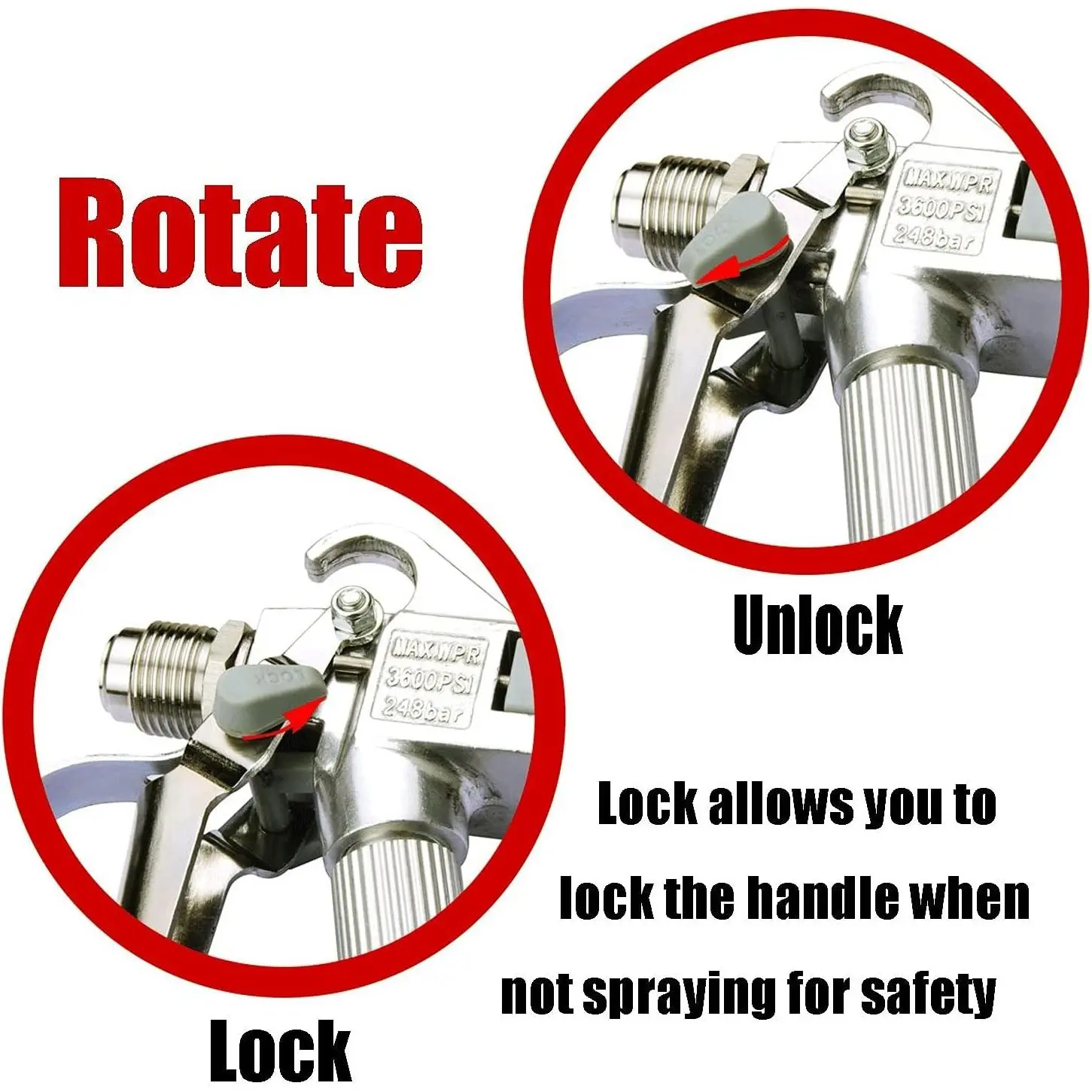 High quality,Doesn't leak.Not including the 517 tipCan be used on most of airless paint sprayersEasy to cleaning the spray gun.3600 PSI Maximum Pressure, four-finger trigger, soft pullInlet fitting 1/4 Inch Thread, Swivel Joint