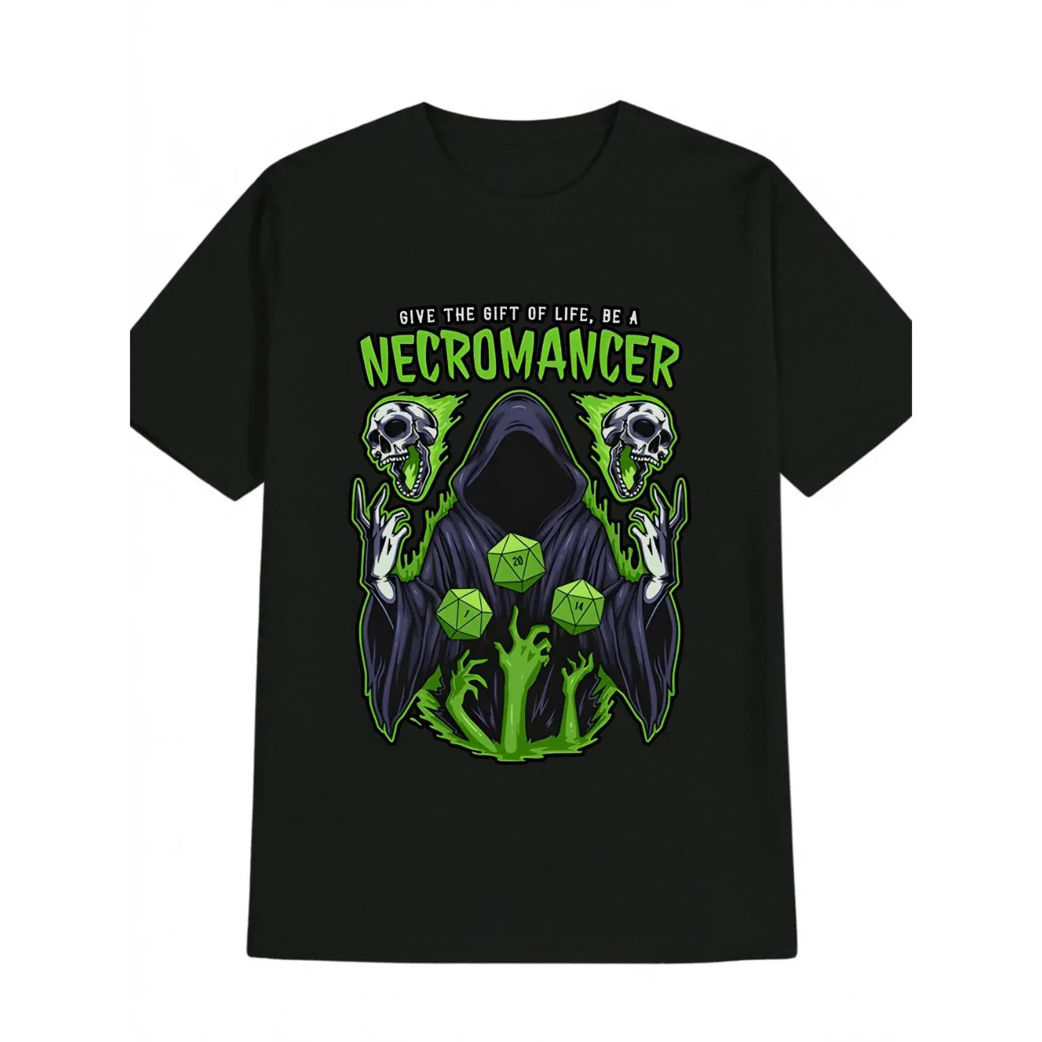 Men's Necromancer Graphic T-Shirt - Black Casual Round Neck Tee with D&D Inspired Skull & D20 Print, "Give the Gift of Life" Fantasy Design, Machine Washable Summer Top for Gamers & Fantasy Fans