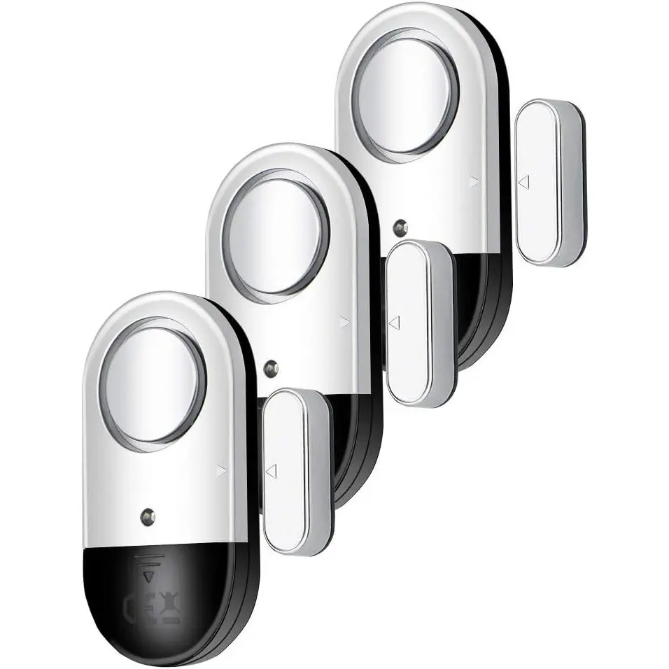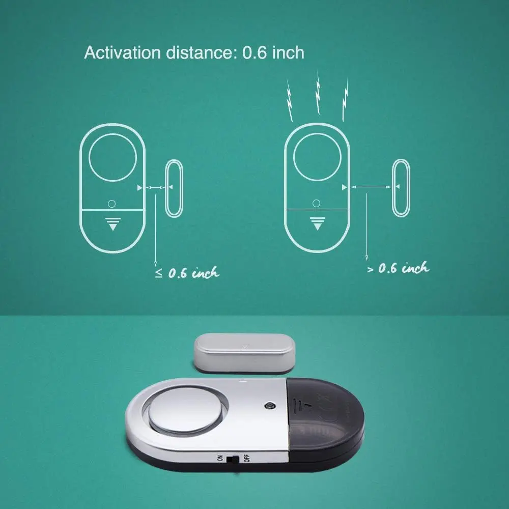 LOUD ALARM: The 120 DB security alarm is perfect forsignaling to you when there is an unwanted entry.Audible at over 750 feet it sounds loud so the person knows they should stop what they are doing.Great for prevention, protect your children’s rooms or stop anyone from sneaking out or in.WIRELESS ALARM SENSOR: No wiring is necessary and3 LR44 batteries are included in each device.Made to last 6 - 12 months these batteries in the alarms will be charged for extended periods of time.When it’s time to change, you’ll know.With the intuitive low battery indicator you can easily find out when you’ll have to change the batteries.EASY TO INSTALL: The wireless security alarms can be installed anywhere with an opening.Simply use the adhesive provided and tape it to wherever you need!Windows, doors, and entrances simple and straightforward with the alarm.The minimum distance for the device to work is 8mm (0.3 inches), so when installing make sure to get both pieces of the alarm as close as possible.SLEEK DESIGN FOR HOUSE- With an ultra slim build and sleek design these alarms can be put easily wherever you need them.Great for attaching to housedoors, all types of apartments, and cabinet or office, put them where you see fit.They may be discreet and simple to install but don’t be deceived these alarms pack a punch, ready to deter any unwanted actions.PACKAGE INCLUDED: 3 * Alarms with tapes (Batteries included), 2 * Anti-noise Ear plugs, 1 * User manual.