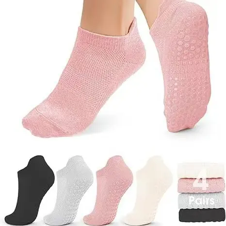 The low-cut, no-show design fits snugly without bunching, while the stretchy, soft material offers a flexible, comfortable fit for all foot sizes. Available in a vibrant 5-pack of assorted colors, these socks are perfect for yoga, barre, dance, home use, and even hospital stays. Durable, washable, and designed to retain grip after repeated use, they combine functionality, comfort, and style in one essential fitness accessory.