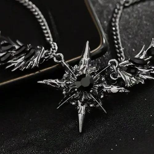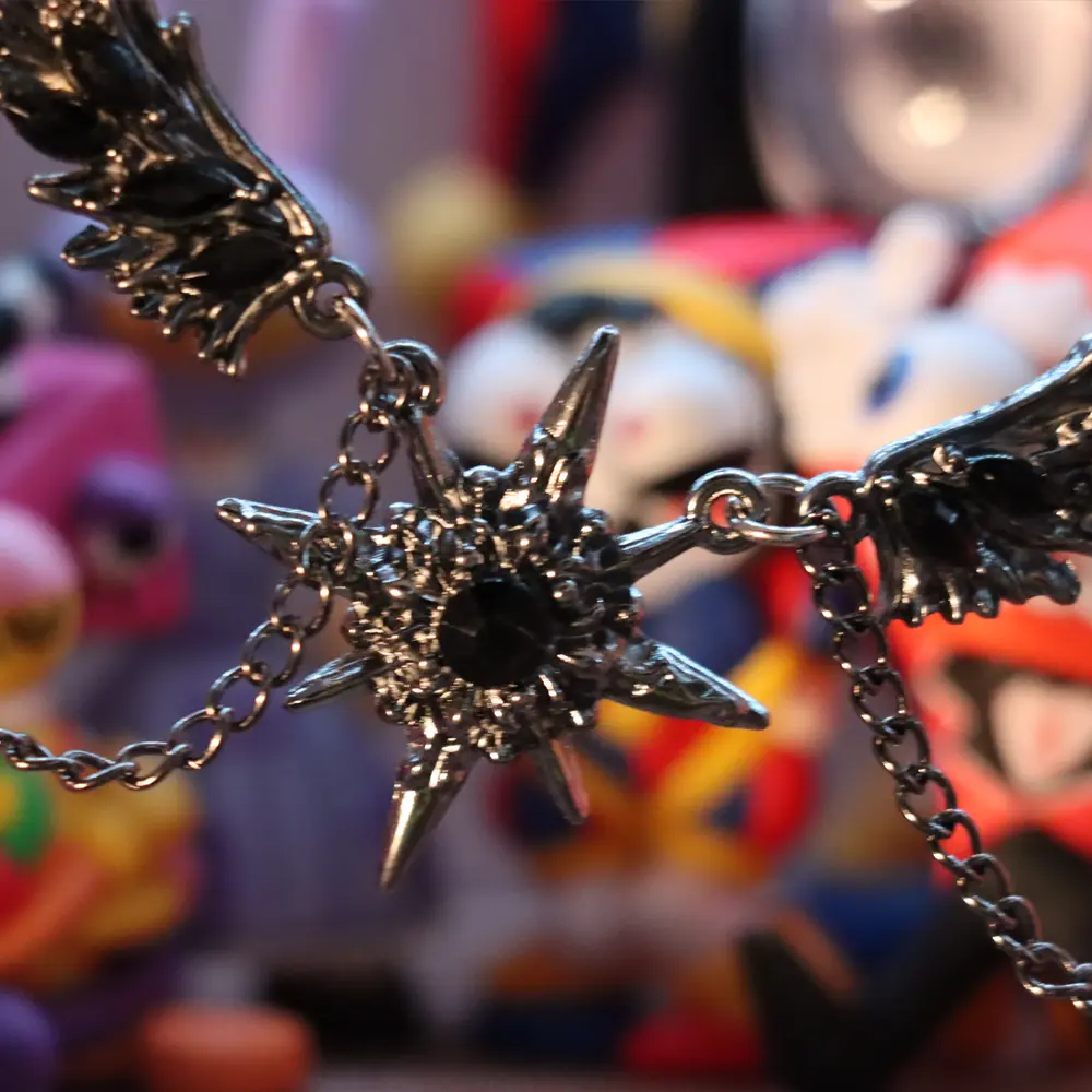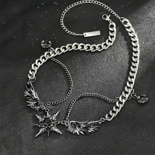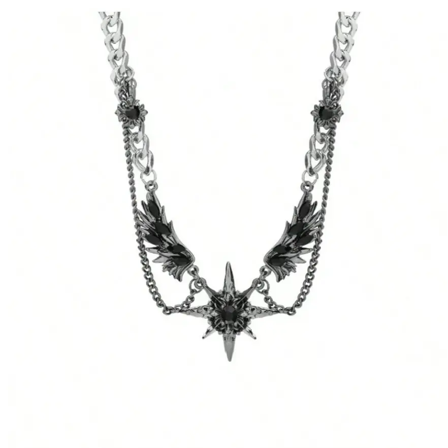 A detailed silver necklace featuring wing‑shaped accents and a central sun pendant with dark stone details. Combines a bold aesthetic with a clean metallic finish, making it ideal for streetwear, night outfits or statement looks. Lightweight, comfortable and adjustable for daily wear. A unique accessory that adds presence and character to any style.