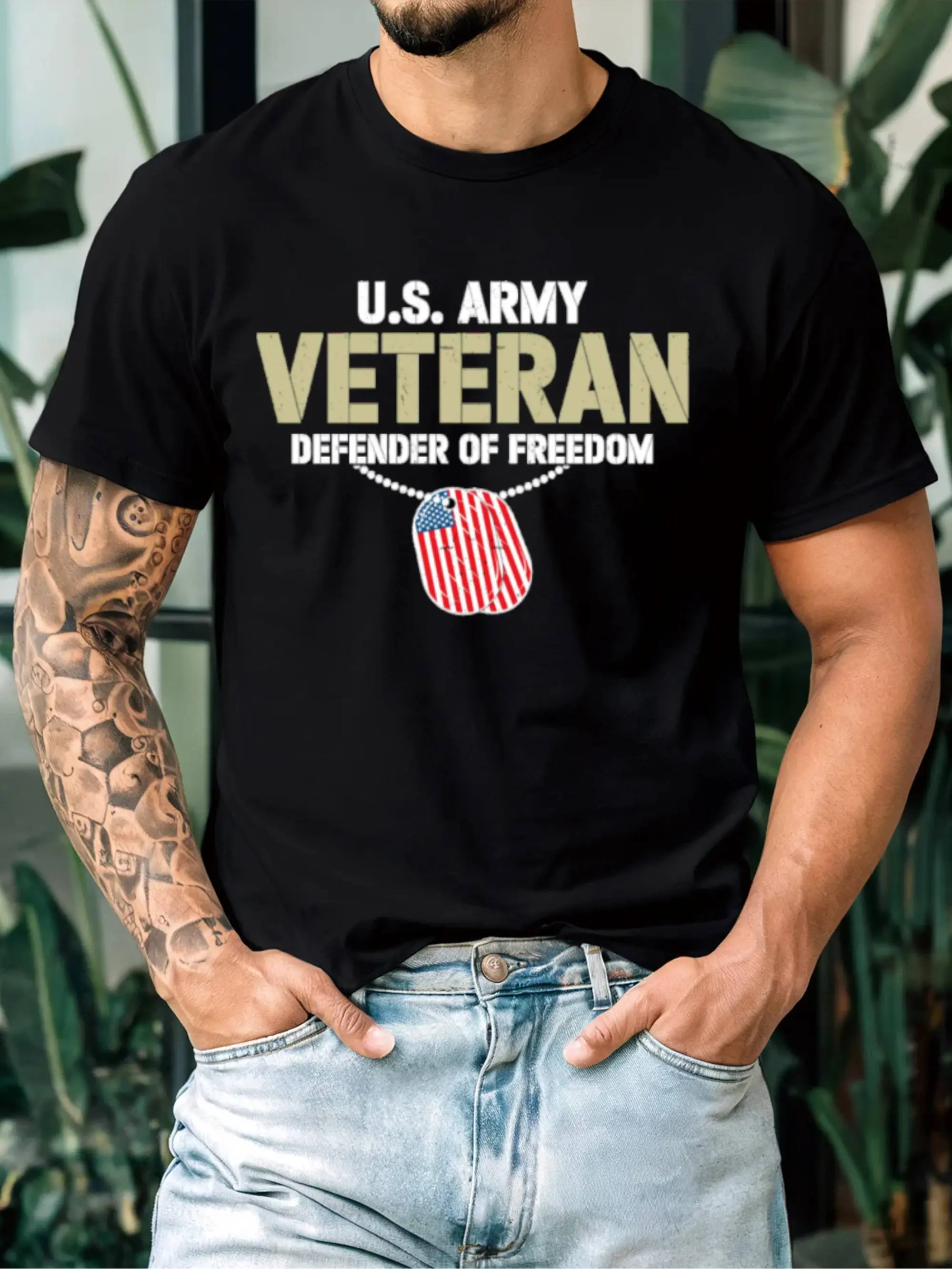 [Graphic Tee] U.S. Army Veteran Defender of Freedom Tee | #Streetwear 100% Cotton Soft Breathable Casual T-Shirt, Comfortable Cool Sweat-Wicking American Flag Dog Tag Graphic Top, Perfect for Army Veterans, OOTD & Daily Wear