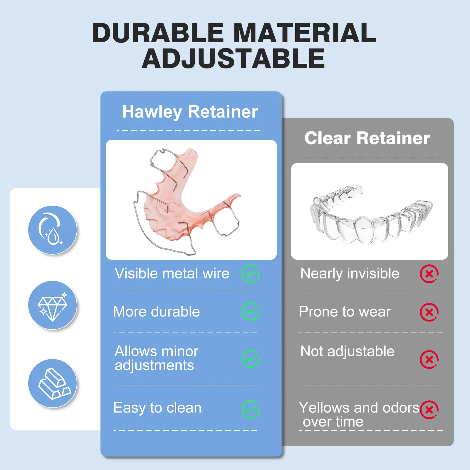 Unlike fragile clear retainers, Hawley retainers feature sturdy stainless steel wires and a food-grade acrylic base. They are built to last for years, allow minor adjustments for a perfect fit, and resist wear and tear far better.