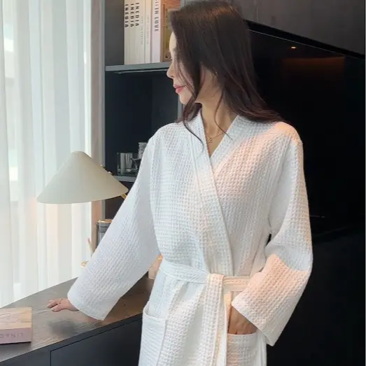 In-stock pure cotton bathrobe, thin spring/summer long waffle robe for hotels and beauty salons, available for direct shipping