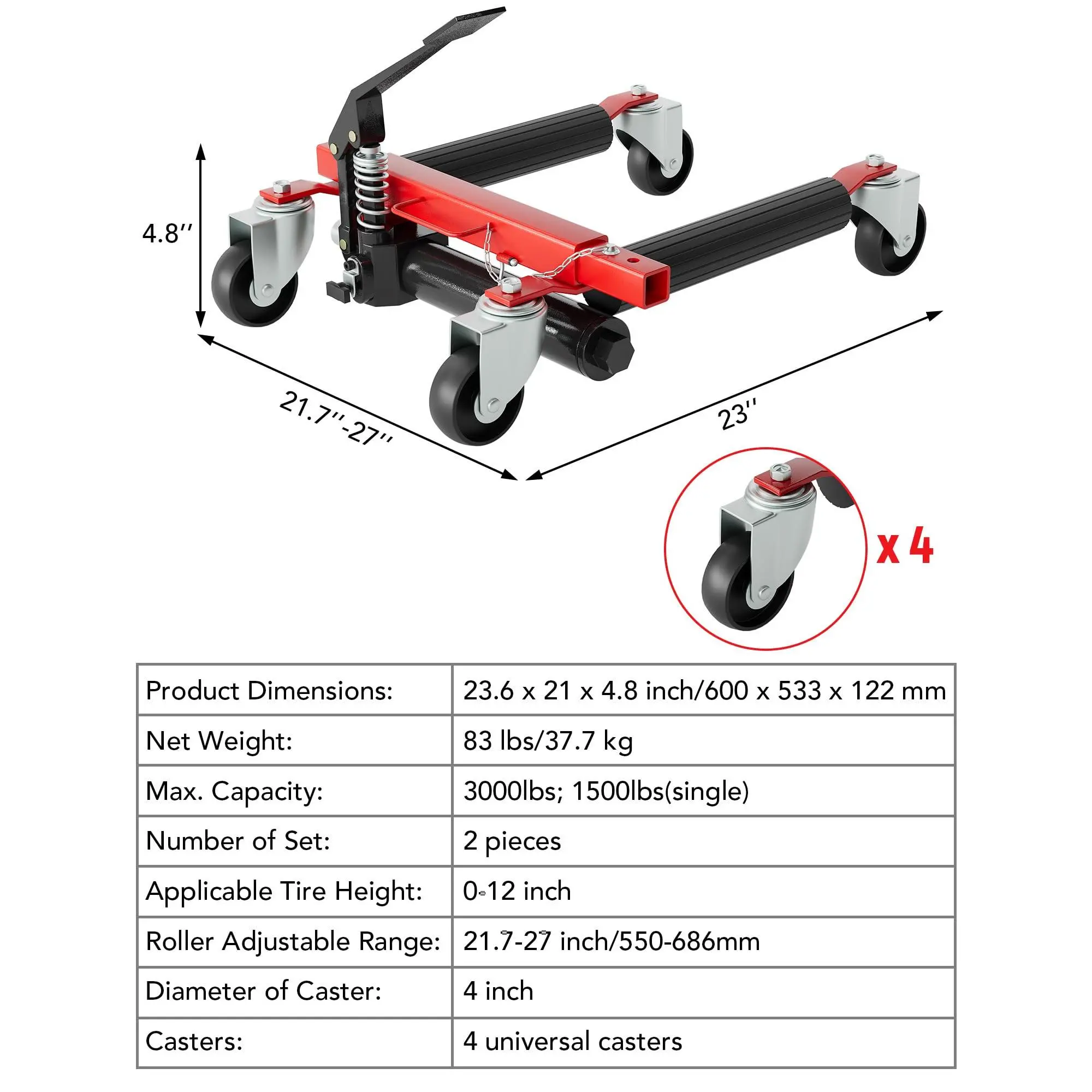 Versatile Tire Compatibility: Accommodate tire widths up to 12 in and a roller stretch ranging from 21.7 in to 27 in, these car wheel dollies are suitable for various vehicle types, facilitating effortless movement, tire changes, repairs, and convenient storage in your garage or trunk