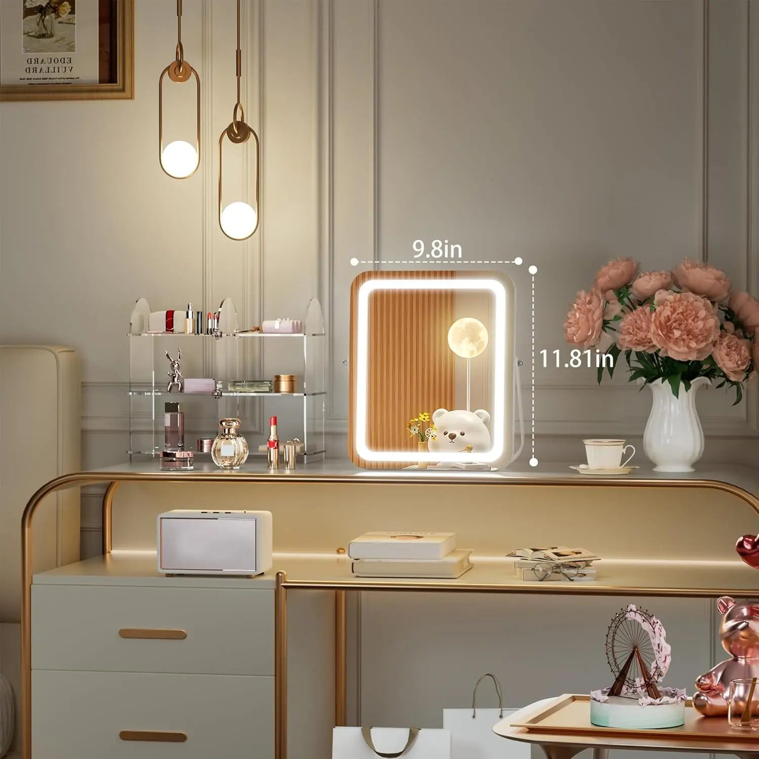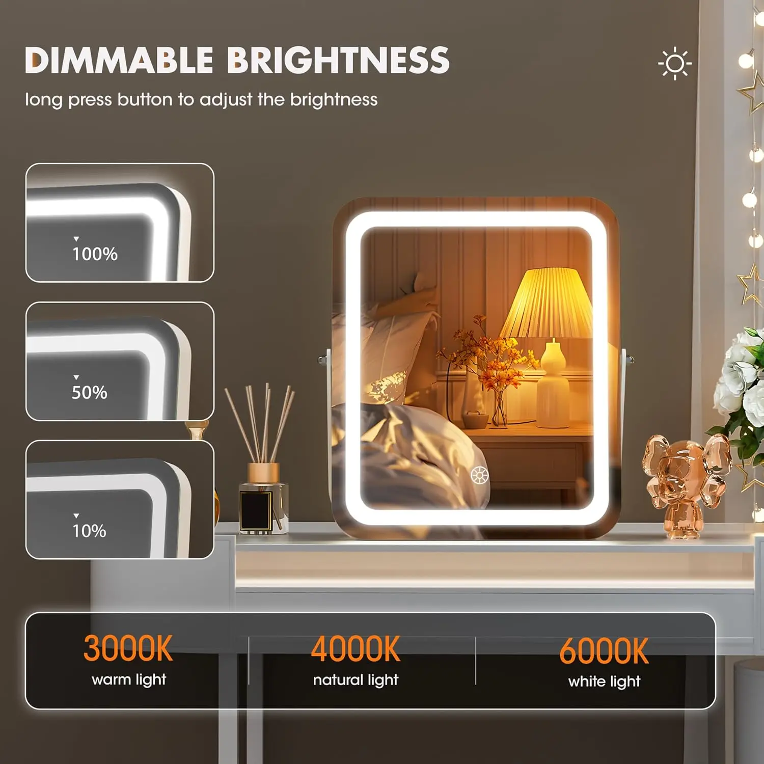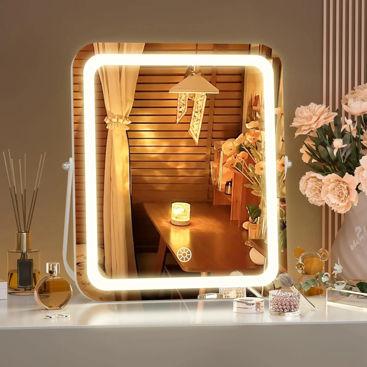👍👍[𝐑𝐨𝐮𝐧𝐝 𝐂𝐨𝐫𝐧𝐞𝐫 𝐑𝐞𝐜𝐭𝐚𝐧𝐠𝐥𝐞 𝐃𝐞𝐬𝐢𝐠𝐧]The vanity mirror with lights is designed with round corner rectangle white frame, it provides a sophisticated look & the modern feeling.The soft edges add visual beauty and ensure safety.The metal frame enhances the mirror's sturdiness and longevity.💡[𝐀𝐝𝐣𝐮𝐬𝐭𝐚𝐛𝐥𝐞 𝐋𝐢𝐠𝐡𝐭𝐢𝐧𝐠 𝐚𝐧𝐝 𝐒𝐭𝐞𝐩𝐥𝐞𝐬𝐬 𝐃𝐢𝐦𝐦𝐢𝐧𝐠] HASIPU led mirror features 3 lighting modes: cold light, warm light, and natural light.Lighted makeup mirror with 50,000 hours life Max 6000 Lumens high brightness LED Light Strip, and the brightness can be adjusted 10%-100%, which can perfectly meet your different makeup needs and make your makeup more delicate.🔘[𝐒𝐦𝐚𝐫𝐭 𝐓𝐨𝐮𝐜𝐡 𝐂𝐨𝐧𝐭𝐫𝐨𝐥]This desk mirror with lights has a smart touch button, turn on/off the light by touching the sensor switch, Short press button to change the color modes, long press button to adjust the brightness.👌[𝟑𝟔𝟎°𝐑𝐨𝐭𝐚𝐭𝐢𝐨𝐧]The mirror allows for 360-degree rotation, making it easy to swivel to any side and find the perfect angle or position for detailed makeup application.It stays fixed in any position, providing you with the perfect perspective.🎁[𝐏𝐞𝐫𝐟𝐞𝐜𝐭 𝐆𝐢𝐟𝐭]This tabletop makeup mirror with lights is very suitable as a gift for girls who love beauty, perfect for birthdays, Valentine's Day, Mother's Day, Christmas, and more. We offer a 12-MONTH Exchange or 30-DAY Money Back Warranty Unconditionally. Please feel free to contact us via if you have any product problems:)