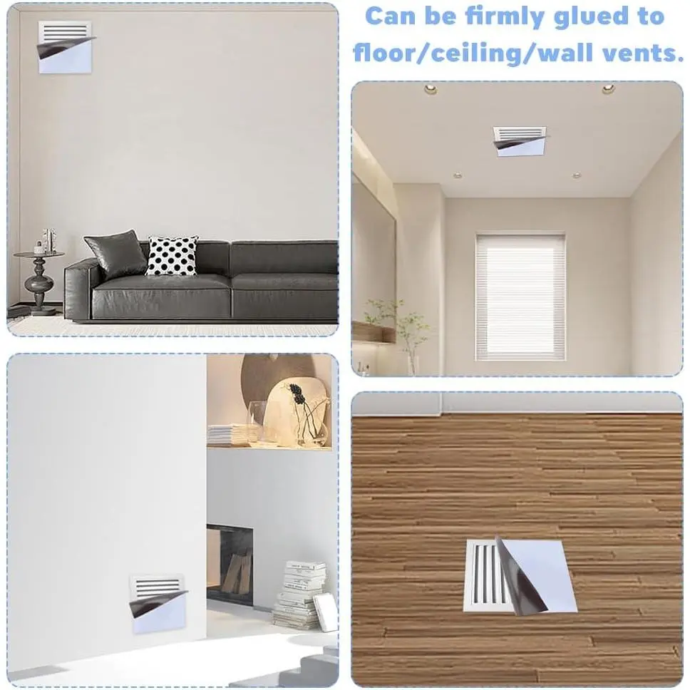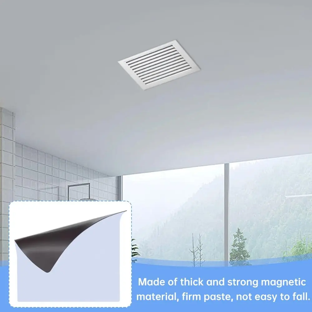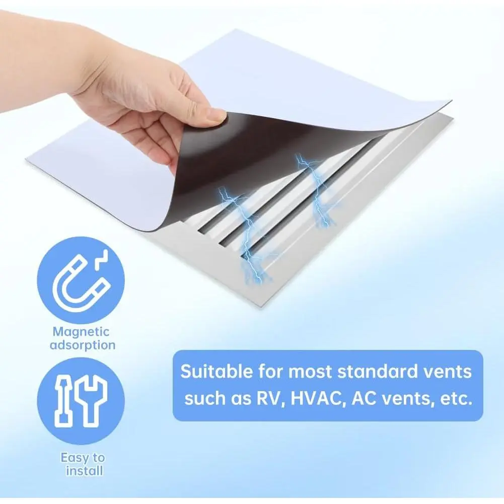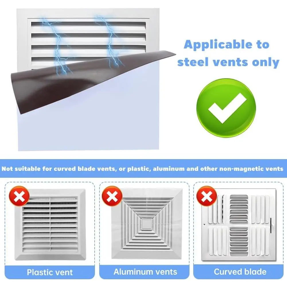 [Package Content]You will get 2 square magnetic floor vent covers, enough quantity for you to replace.Magnetic floor vent covers can reduce your energy costs because unused space will not be heated or cooled.Size: 304x304x1.5mm/11.97x11.97x0.06 inches (LxWxT).[Keep Comfortable]Our magnetic vent covers block cold air, improve insulation, and reduce noise between rooms.These covers are both practical and stylish, perfect for any magnetic duct vent cover needs.[Suitable Size]Suitable for most standard air conditioners.You can also cut magnetic register vent covers as needed, which is very convenient to use.Installation method: surface mount.[Applicable]Only for steel vents.Not suitable for curved blade vents with blades/fins protruding more than 3mm (1/8 inch).Not suitable for plastic or aluminum vents.These materials will not stick magnetically.Please test with a small magnet: if the magnet does not stick, our covers will not stick either.[Widely Used]Great for HVAC systems, air conditioning units, heater vents, and more - Great for noise reduction in homes, basements, RVs, and apartment buildings.