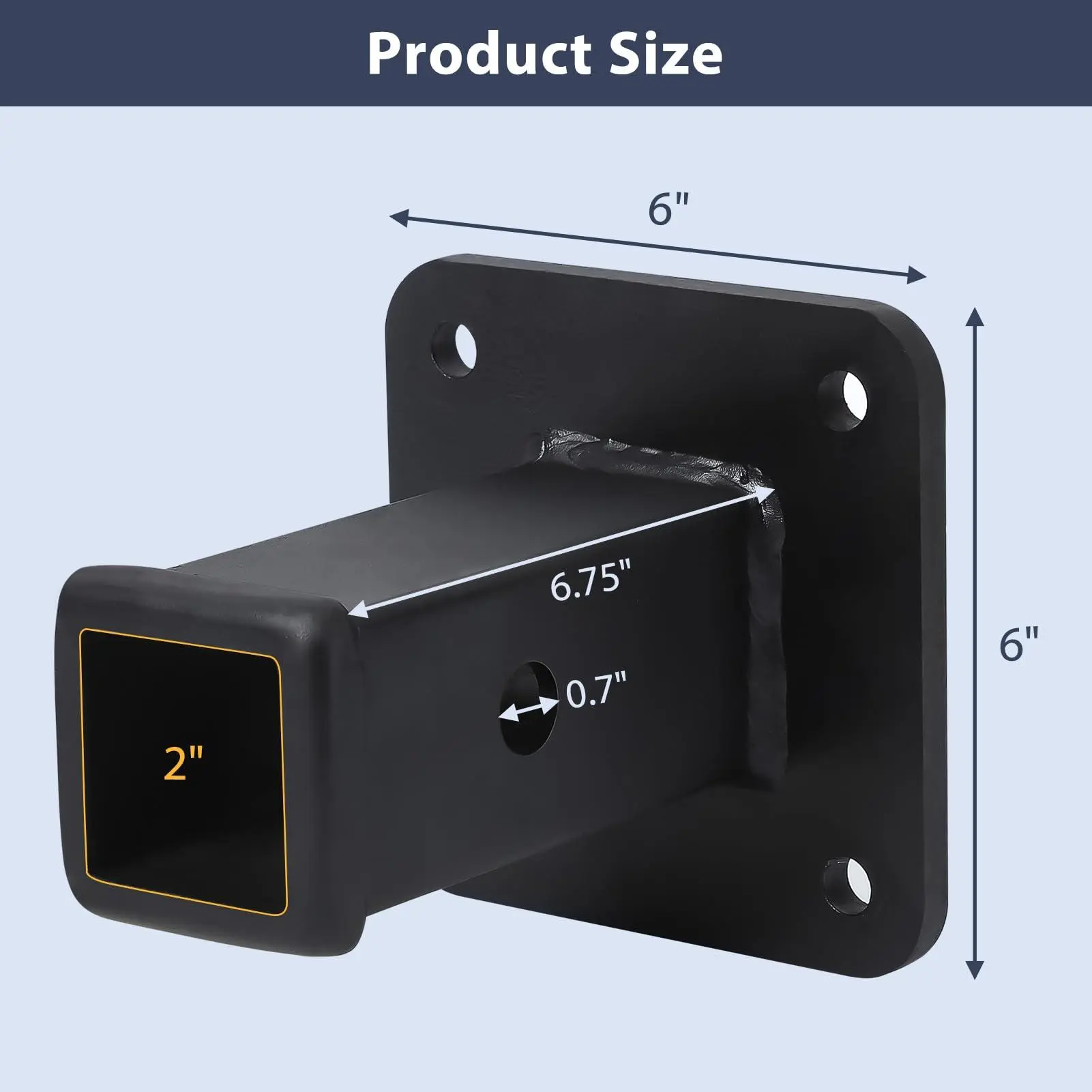 【 Fits All 2-inch Receiver Ports】This 2-inch hitch extender is 6.75 inches long and is welded to a 5/6-inch steel mounting plate. Port of trailer receiver tube is thickened raised, and the whole tube thickness is upgraded for more safety and durability.
