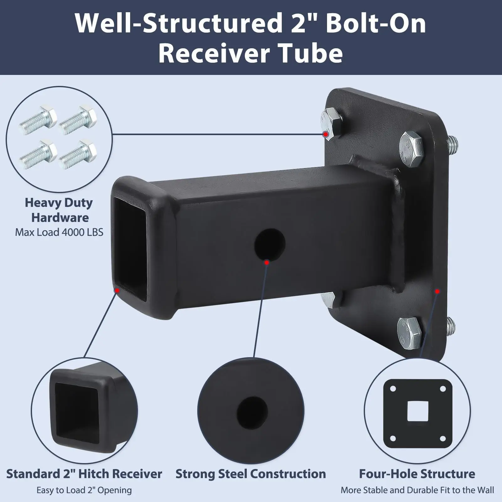 【4-Holes Easy to Install】This towing hitch receiver its standard 4-holes pintle hook pattern (bolts and screws included), bolt this tube weldment to the hitch plate using 4 M12 bolts, bolts right on using existing holes in the front frame, quick installation, installs and removes in seconds.