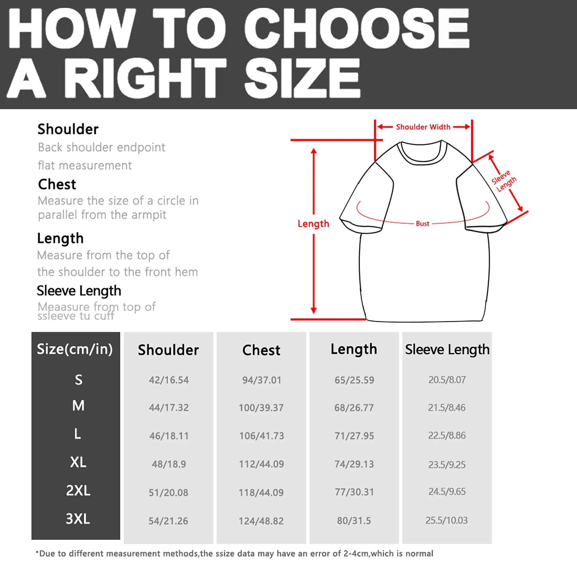 Please Note: Due to different manual measurement methods, a slight variance of 1-3 cm (0.4-1.2 inches) is within the normal range.