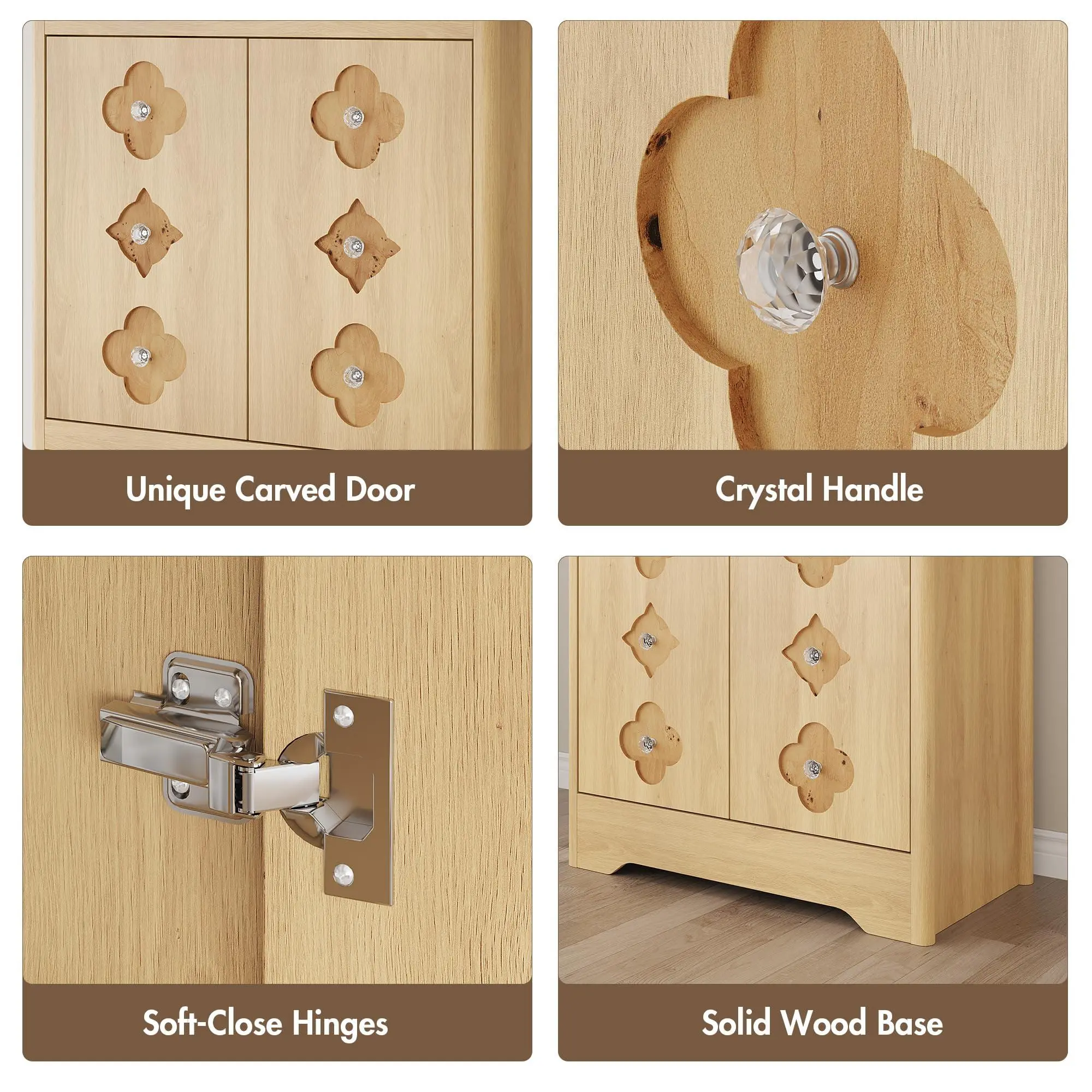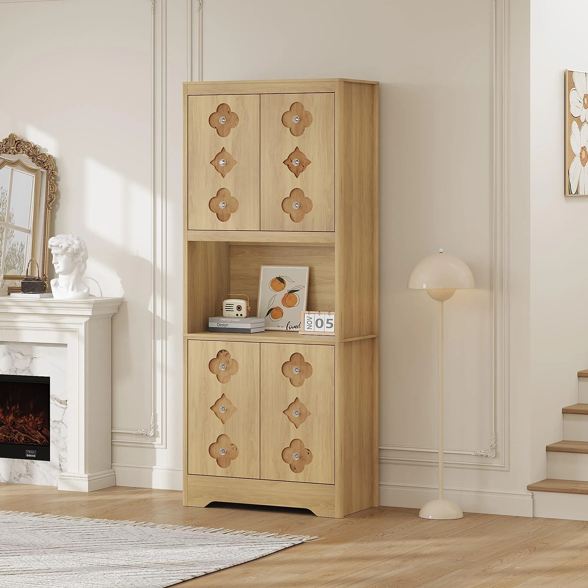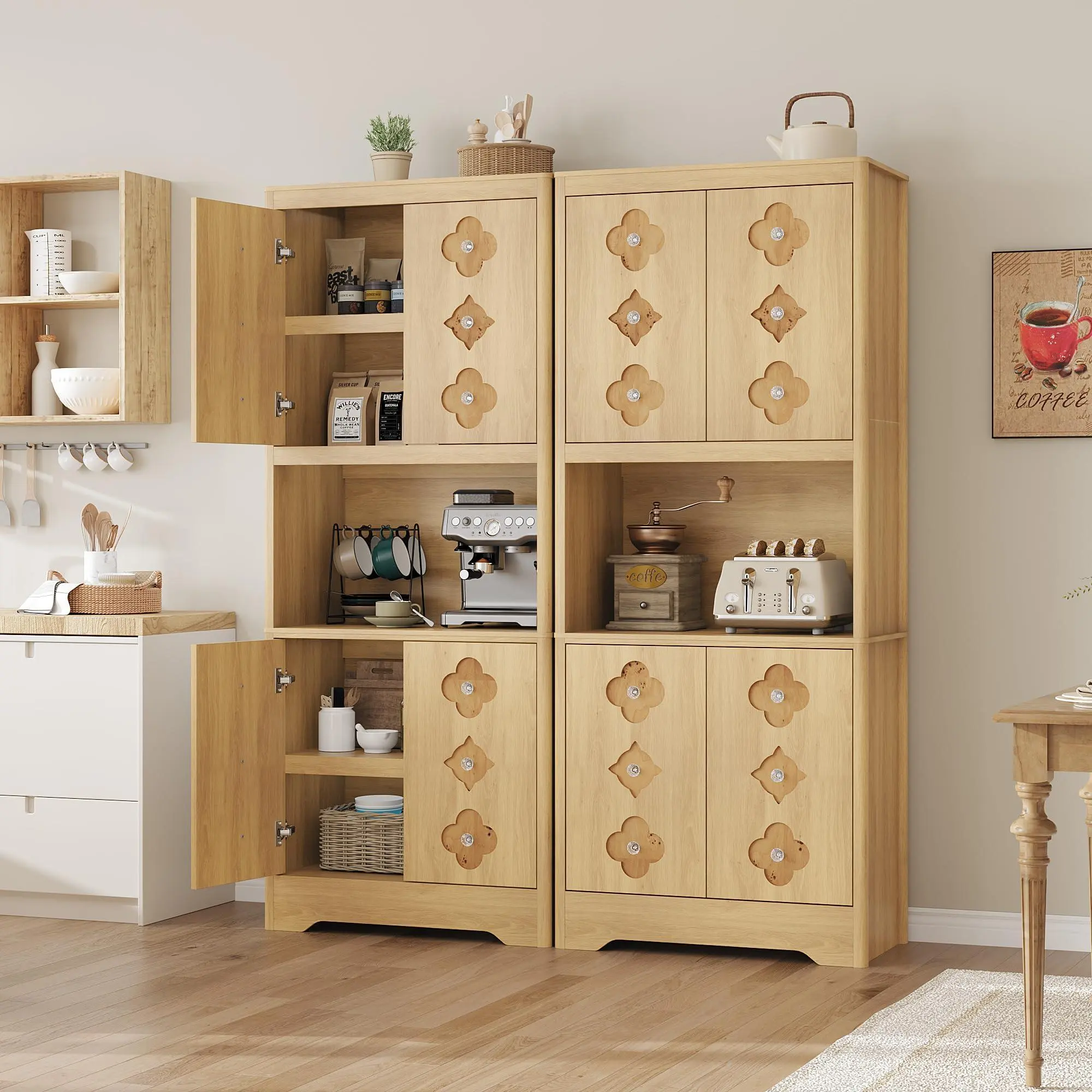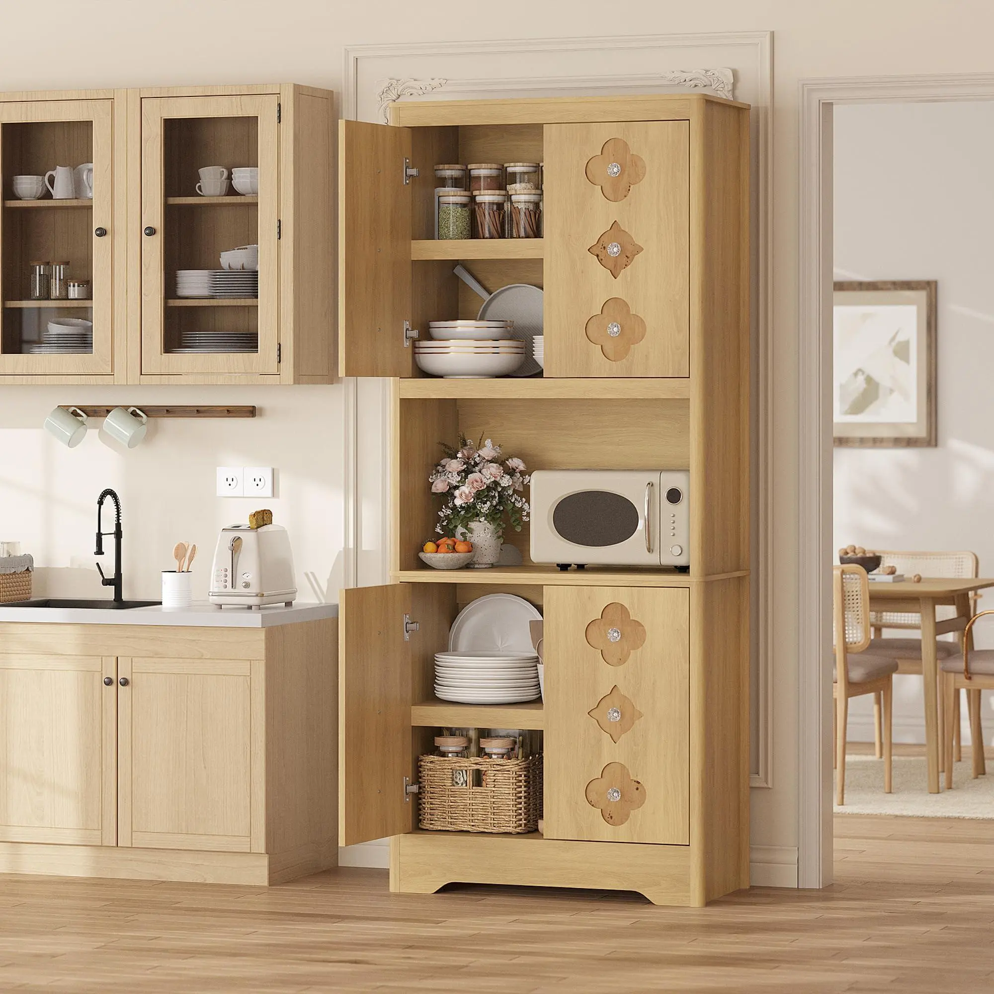 VINTAGE-CHIC PANTRY: This tall pantry storage cabinet features intricate hand-carved details and sparkling crystal knobs, bringing cozy nostalgia to your space—elevating it from basic storage to a decor centerpiece. Its realistic wood grain and smooth finish complement all styles, while magnetic door closures and child-safe rounded edges blend eye-catching design with family-friendly safety