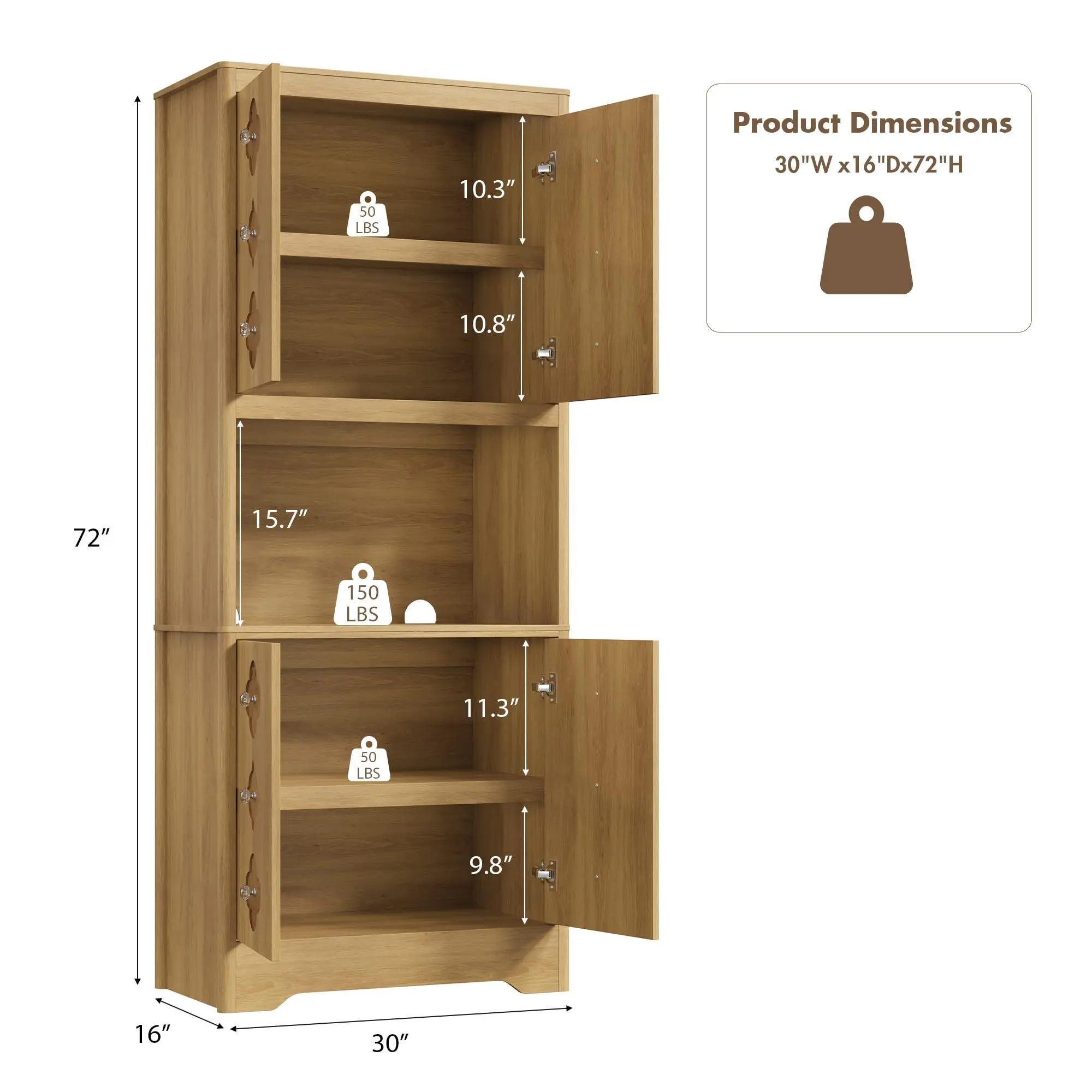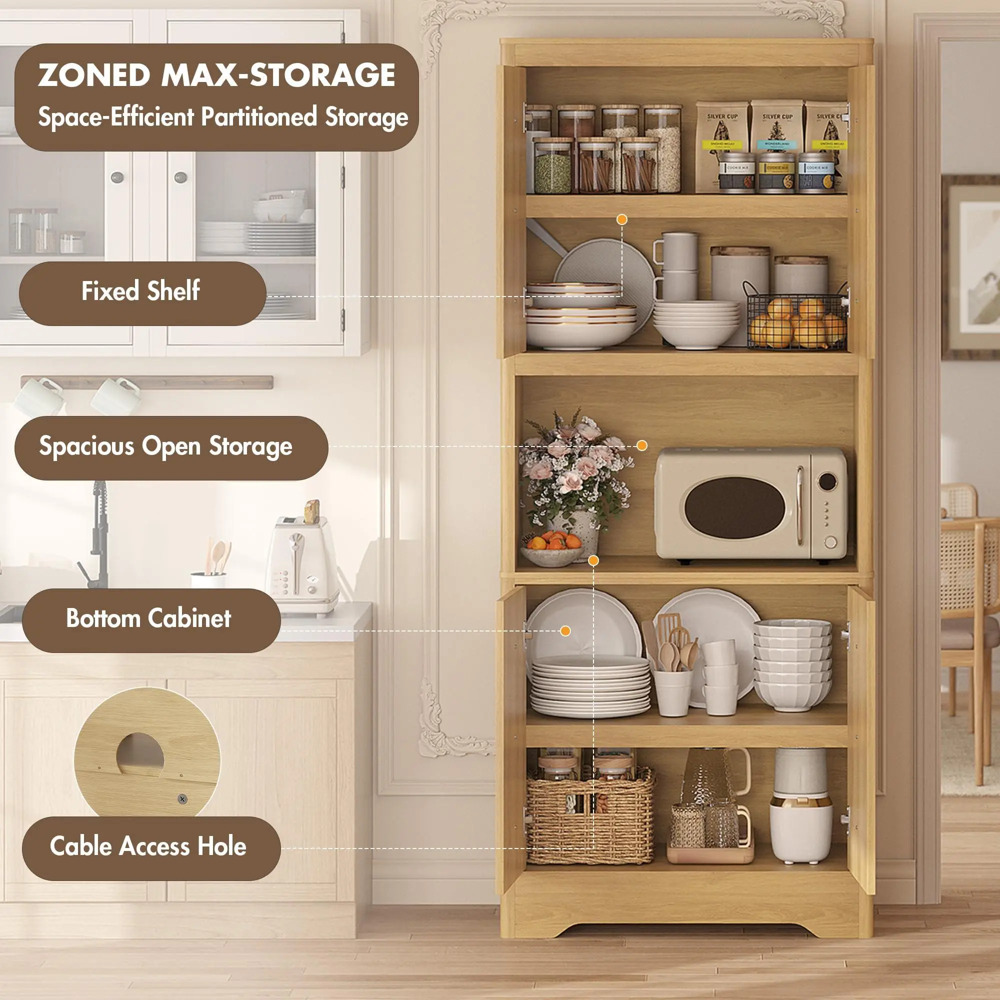 MAXIMIZE VERTICAL STORAGE WITH SMART ZONING: This space-saving kitchen pantry cabinet has 2 enclosed cabinets and a 15.7”×27.4” open shelf for layered organization. The open section holds microwaves, coffee makers, and small appliances, while closed cabinets stow tableware, snacks, and essentials. At 72 inches tall, this tall cabinet maximizes vertical space use, ideal for compact kitchens and dining areas