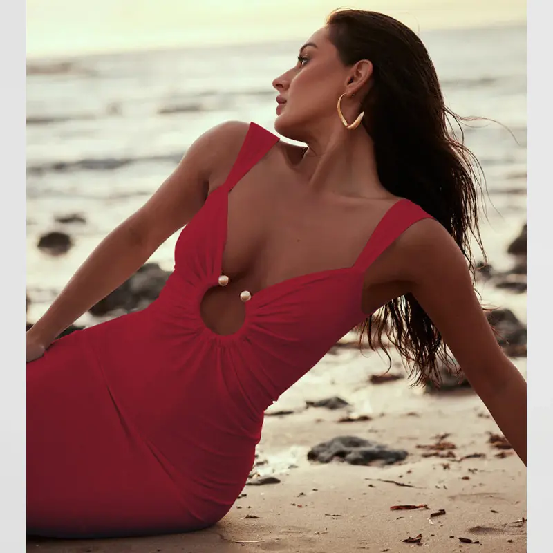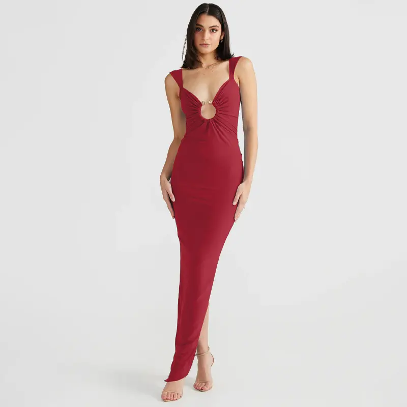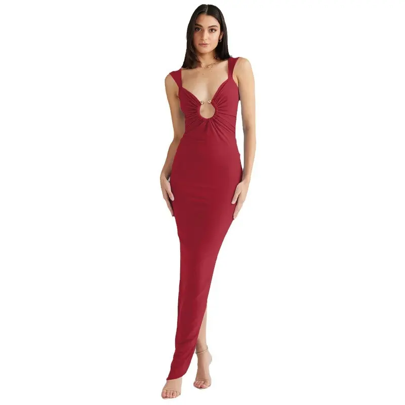 Sexy hollow dress with mesh splicing, mid-length slit bodycon skirt, solid color pullover dress, evening gown