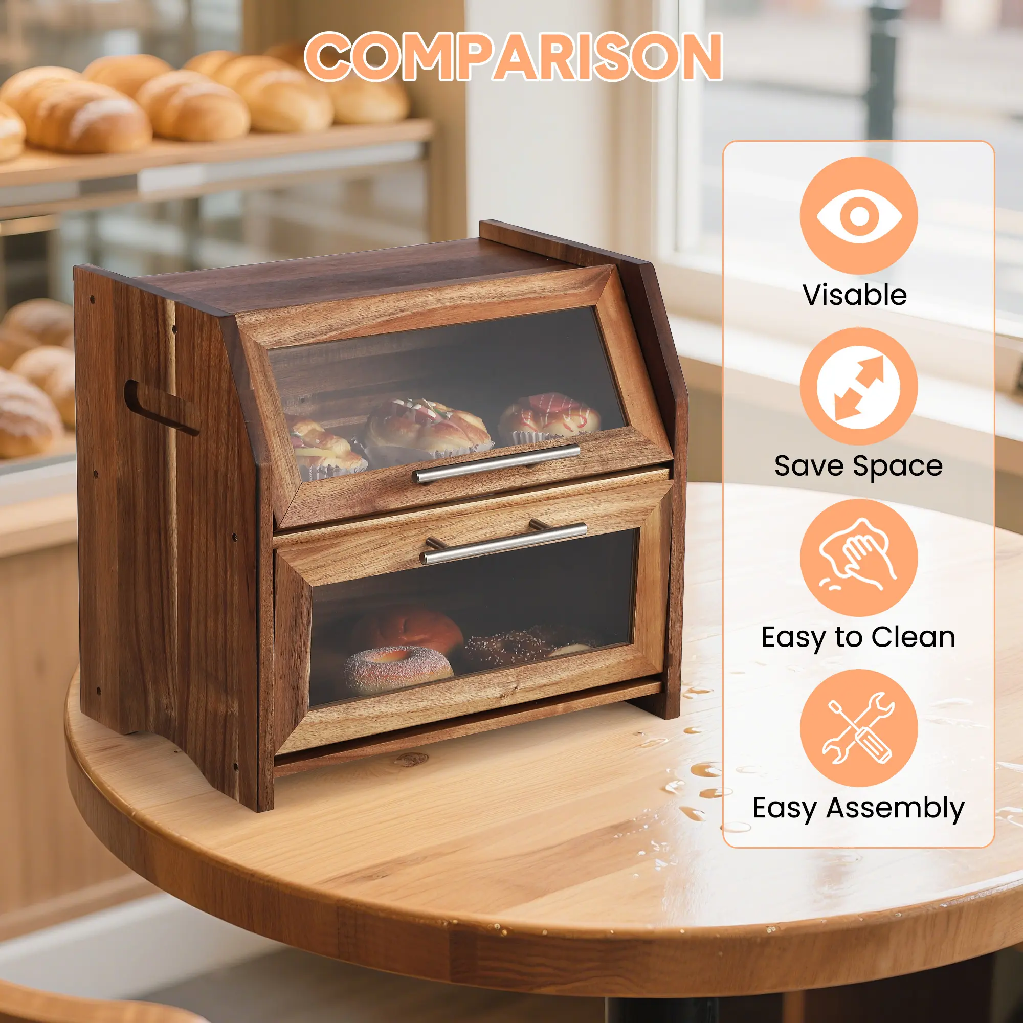 2 Layer Bread Box – Features: Large Capacity, Clear Door Panels, Air Vents, Farmhouse Acacia Wood Design – Perfect Kitchen Countertop Bread Holder for Bread, Bagels, Rolls – Brown