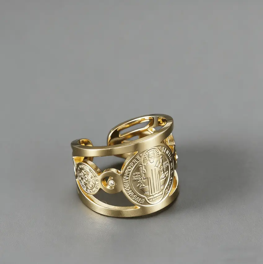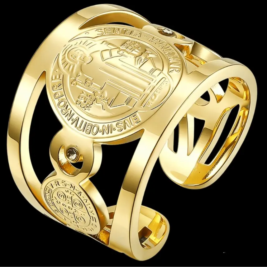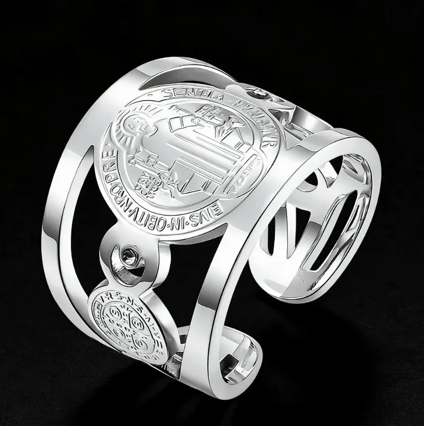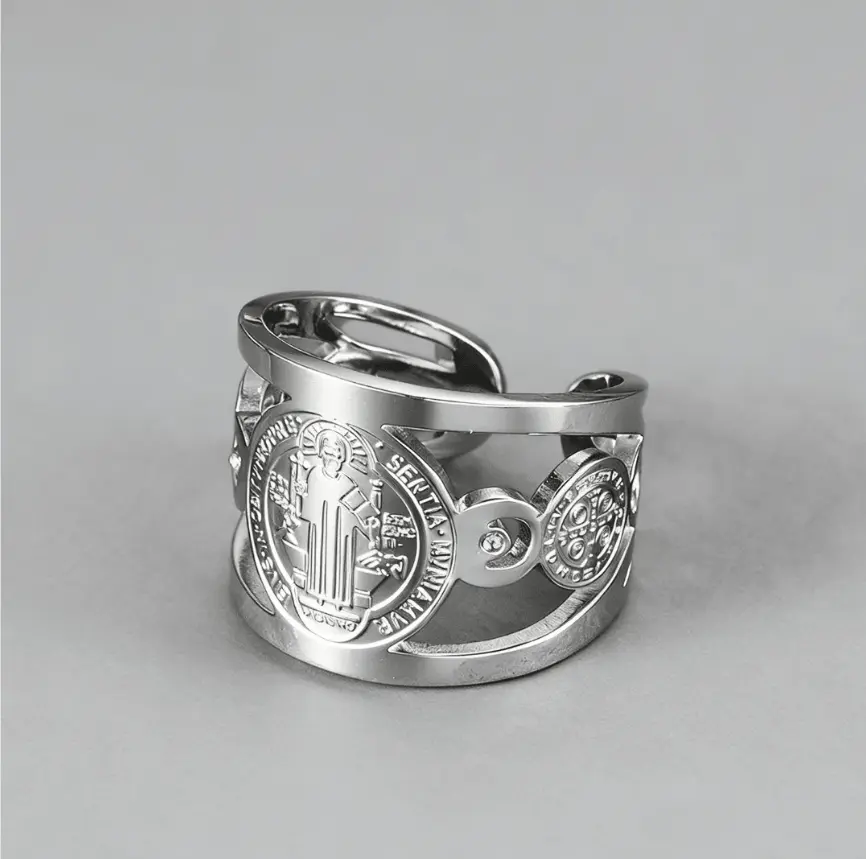 This St. Benedict adjustable ring features an engraved religious design accented with sparkling cubic zirconia.
