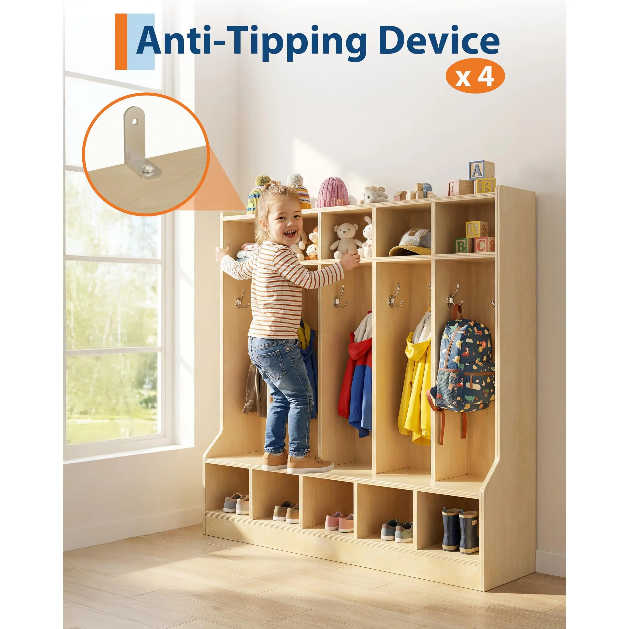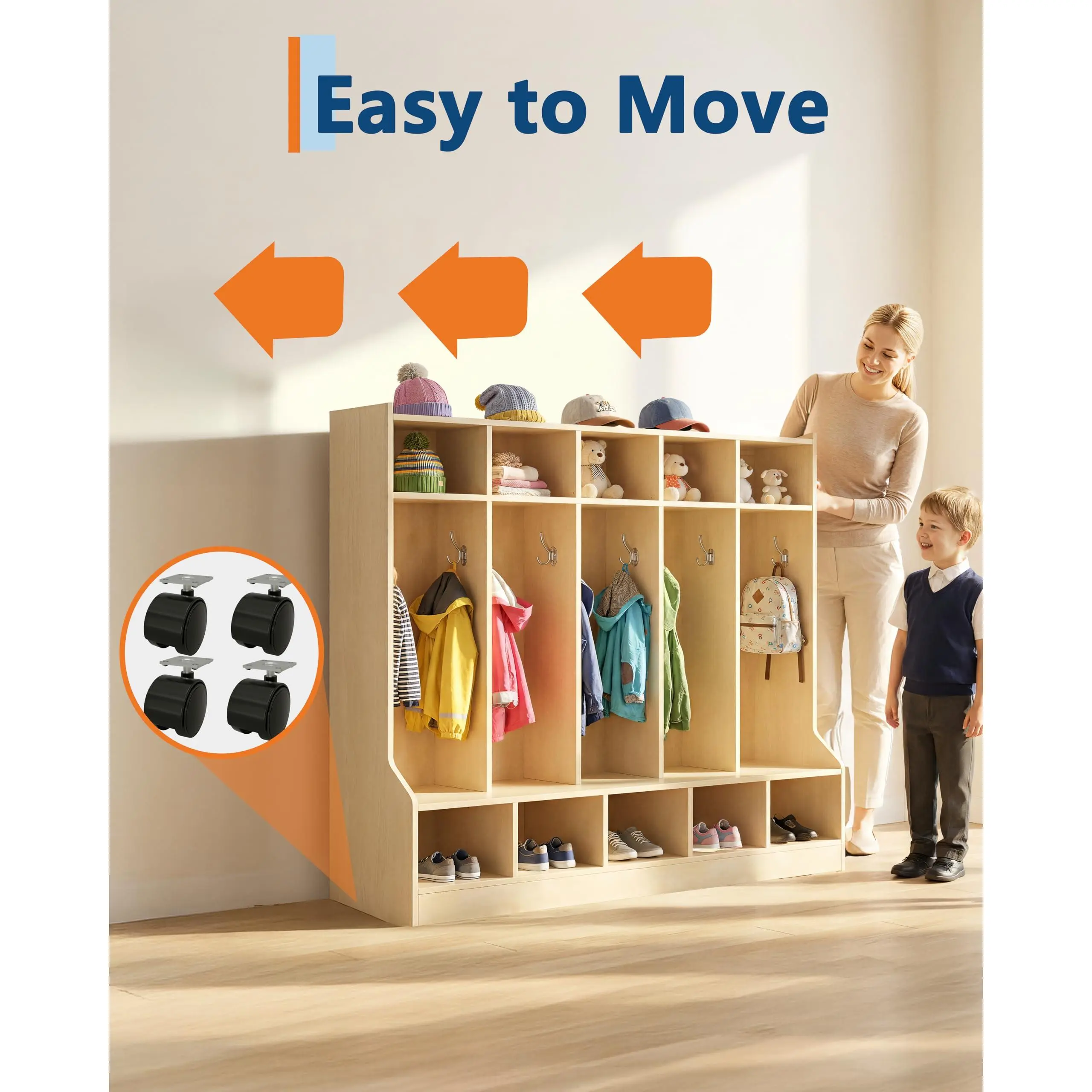 🌱Spacious & Well-Organized🌱🌱 With 5 open long compartments, 5 top cubbies, and 5 bottom cubbies, there’s plenty of room for backpacks, books, and school supplies. It also comes with 5 coat hooks and 2 storage boxes to neatly store coats, hats, and small personal items. From the classroom to the playroom, everything has its own place.