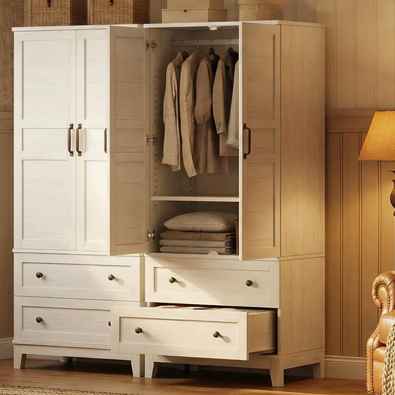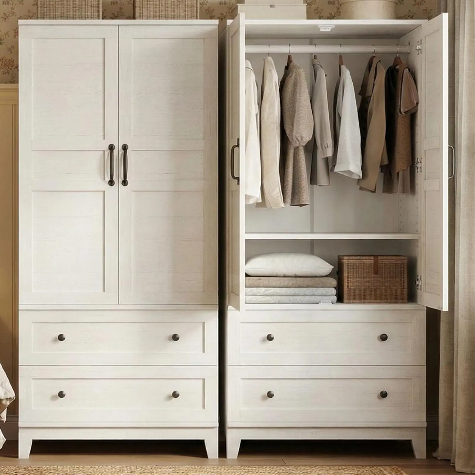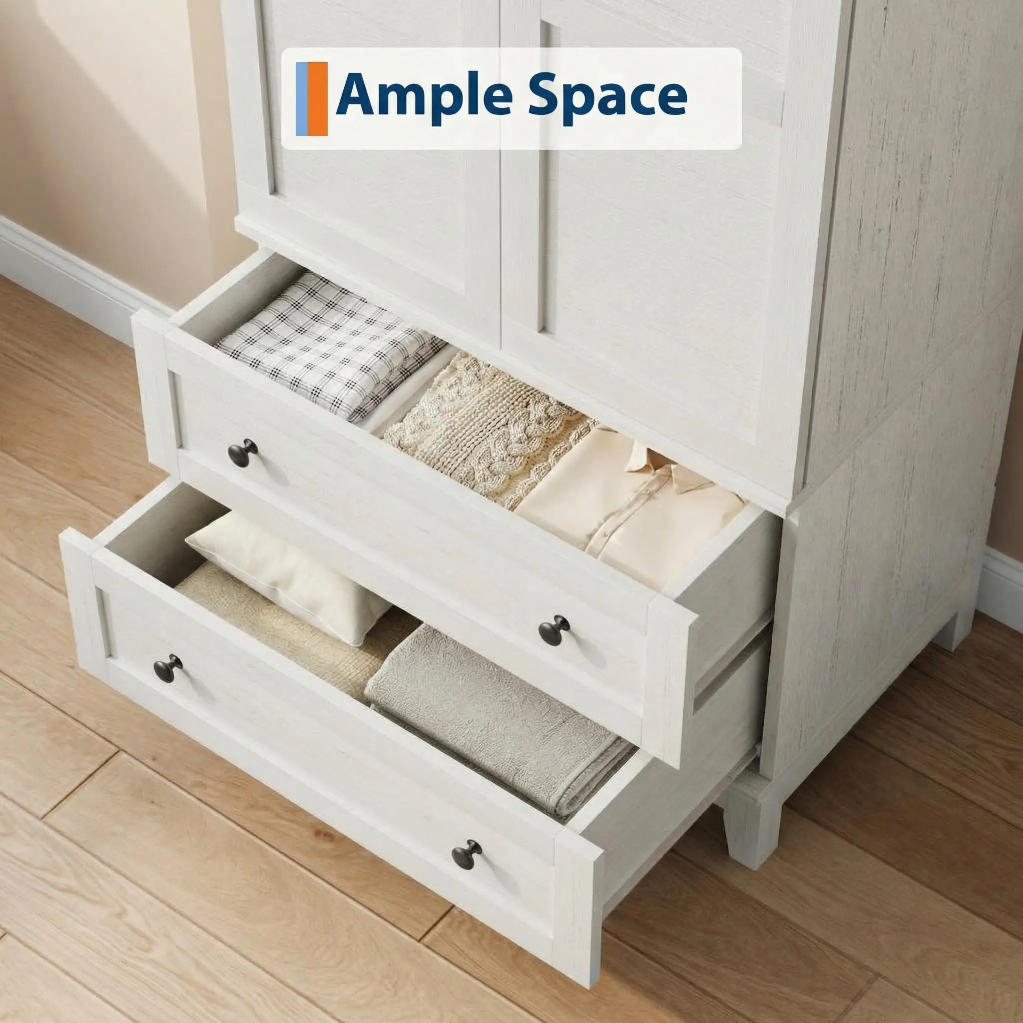 Deep Design for Maximum Capacity: Unlike shallow cabinets that crush your clothes, our 21.11-inch-deep wood wardrobe cabinet ensures hangers sit . Combined with 2 large bottom drawers, it’s a complete organization system for folded laundry, accessories, socks, and seasonal gear. Dimensions: 31.58 in W x 21.18 in D x 72.08 in H.