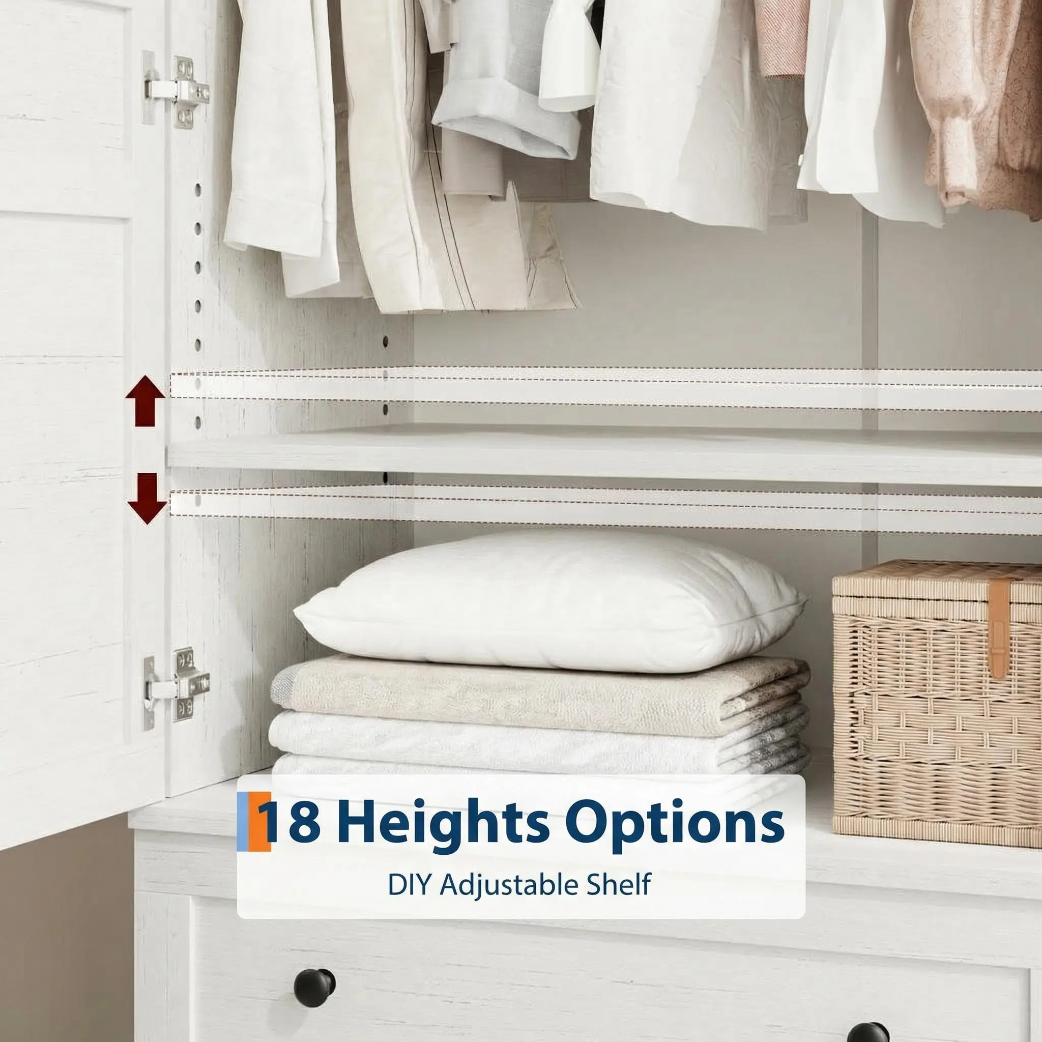 Customizable DIY Storage Solution: Take control of your space! Featuring a unique adjustable shelf with 18 pre-drilled holes, this wooden armoire wardrobe allows you to customize the interior layout. Remove the shelf for long dresses and coats, or adjust it to various heights to accommodate shorter shirts, storage bins, or even a dedicated section for a teenager's wardrobe.