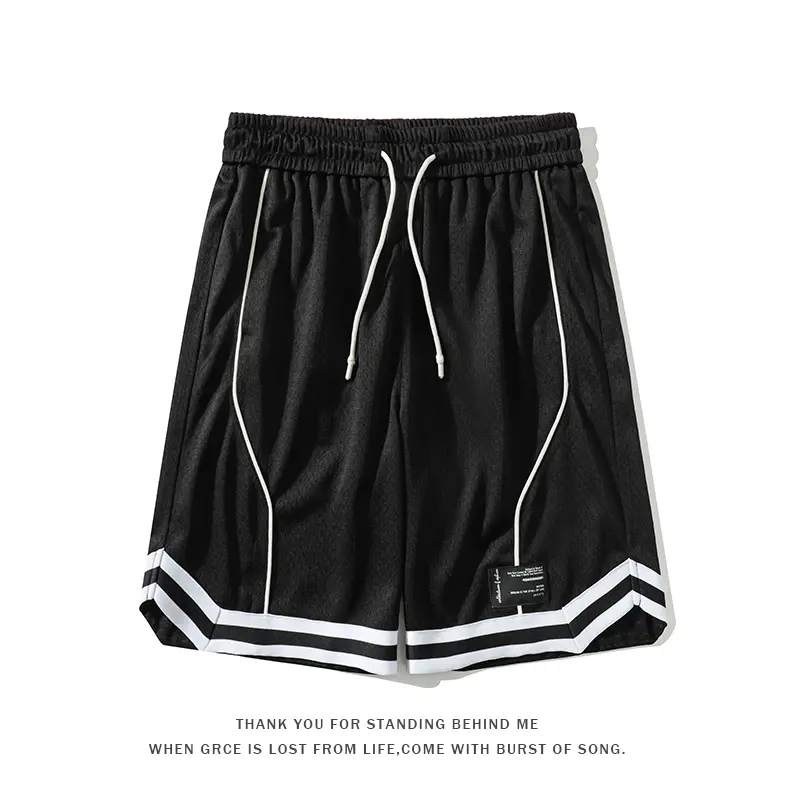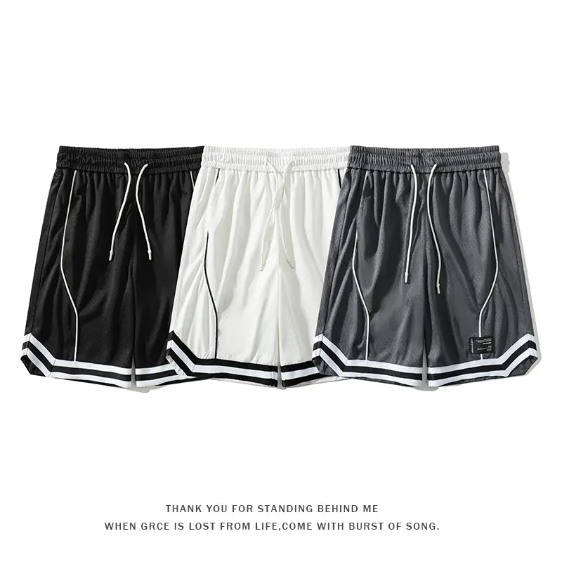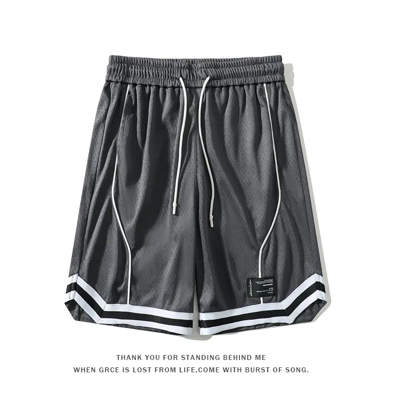 Men’s summer American-style mesh basketball shorts with stripes, side slits, casual knee-length shorts