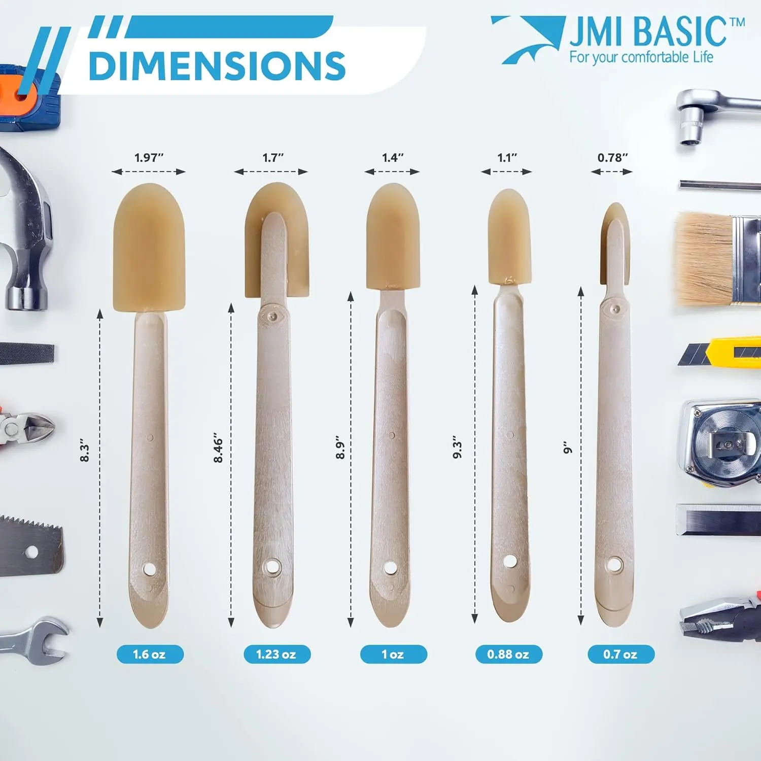 CAULK SMOOTHING TOOL - Made from scratch-resistant, flexible elastic urethane rubber, not only does this caulking spatulas kit provide an efficient, secure seal, but it also is useful for caulking or Grouting large areasfor waterproofing.The spreader tool gives you a professional-looking seal to your DIY work every time.ERGONOMIC HANDLE GRIP - This spreader tool has a longer handle, which makes it more comfortable to use when you're caulking, so work fatigue is lower!The ergonomic handle is made from ABS Foam Resin, which is easy to grip and stronger than wood and other plastic, also almost no transform, discoloration or deterioration.so it's better to use for a long times and home improvement projects, to achieve a professional finishFLAWLESS FINISH - Achieve a flawless finish every time.It's easy to achieve a uniform and smooth seal when you're caulking or grouting, with JMIBASIC's caulking applicator.Designed to be angled and with 4 sizes you can use this caulking finishing tool for caulking a variety of curved surfaces around your home.It's great to use in the bathroom, bathtub, shower, kitchen, utility room for sink joints, window, glass, wall and floor.EASY TO CLEAN and REUSABLE - Save time and money when you use this handy caulk finisher with rubber.Although created with a flexible rubber tip to ensure effective and smooth application, thisalso makes the caulk spreader tool easy to clean and reusable.Simply wipe with a wet tissue after use to maintain the condition, so it's ready to use when you need it.WIDE APPLICATION and HOME-USE - JMI BASIC's caulking silicone spreader is great for everyone to use, from beginners to professionals.It's simple to apply sealer products with this silicone caulking tool, which makes it suitable for use - it has a flexible tip for a smoother, move even spread, which reduces product waste, and is useful for various application professional caulking for tile joints, waterproofing, architectural construction and exterior, and interior construction.DURABLE and ELASTIC - Made with high-quality urethane rubber for long-lasting useACHIEVE PROFESSIONAL RESULTS - Flexible rubber tip reduces waste and allows for a smooth, seamless, uniform, and professional-looking finish every time.