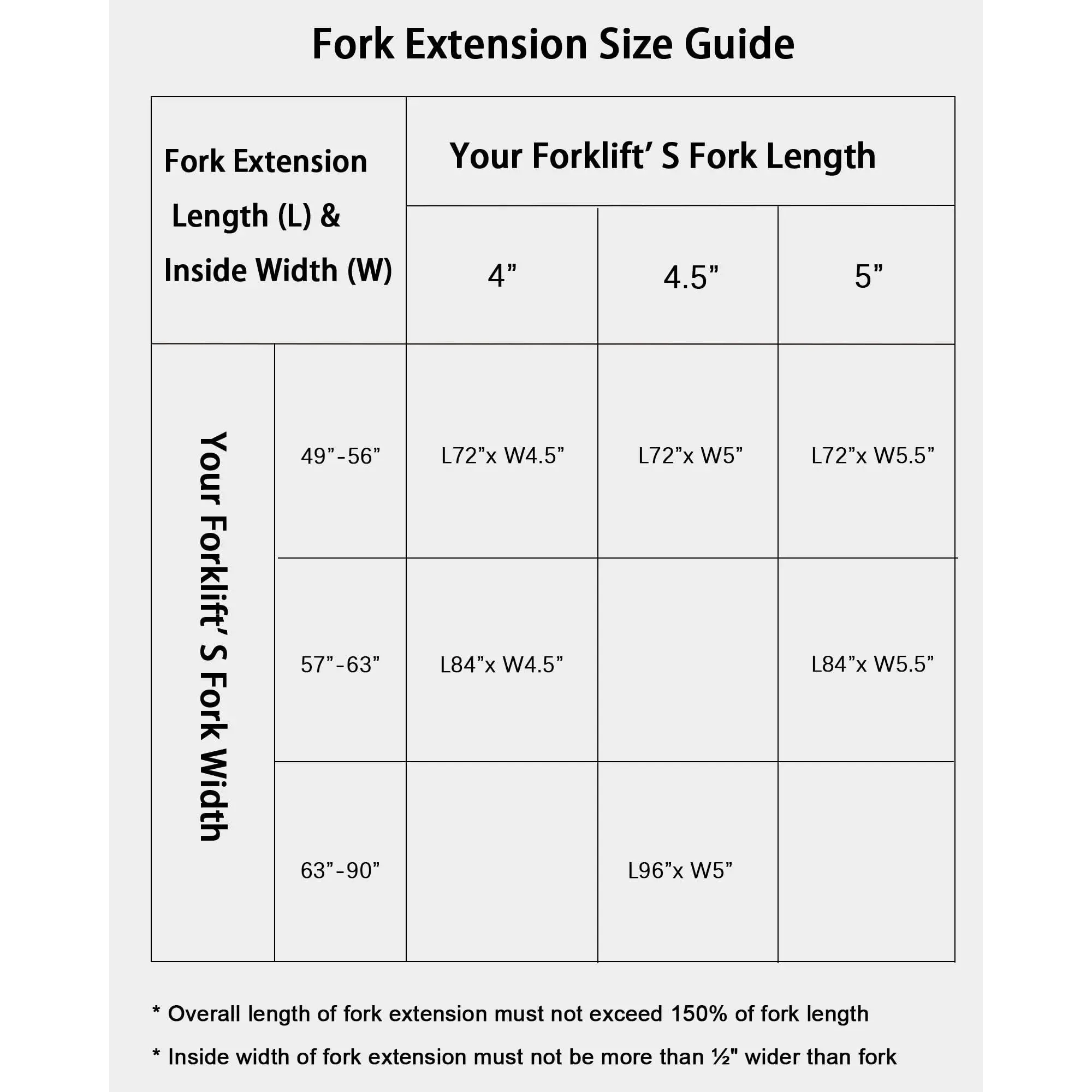 Suitable for 4.5-inch wide forklift: features 84-inch length and 4.5-inch width for 4.5-inch wide forks; extends the size of the original forks to carry more cargo per lift.