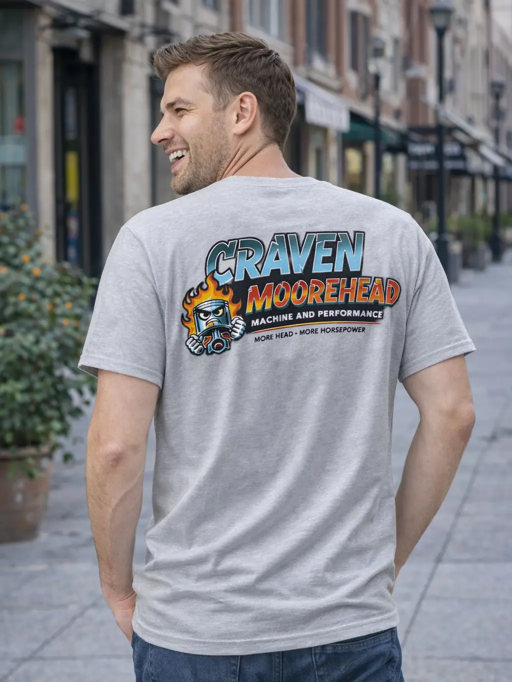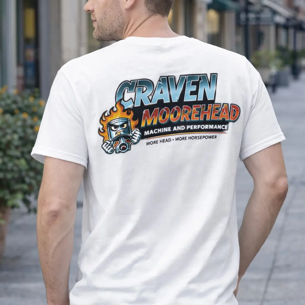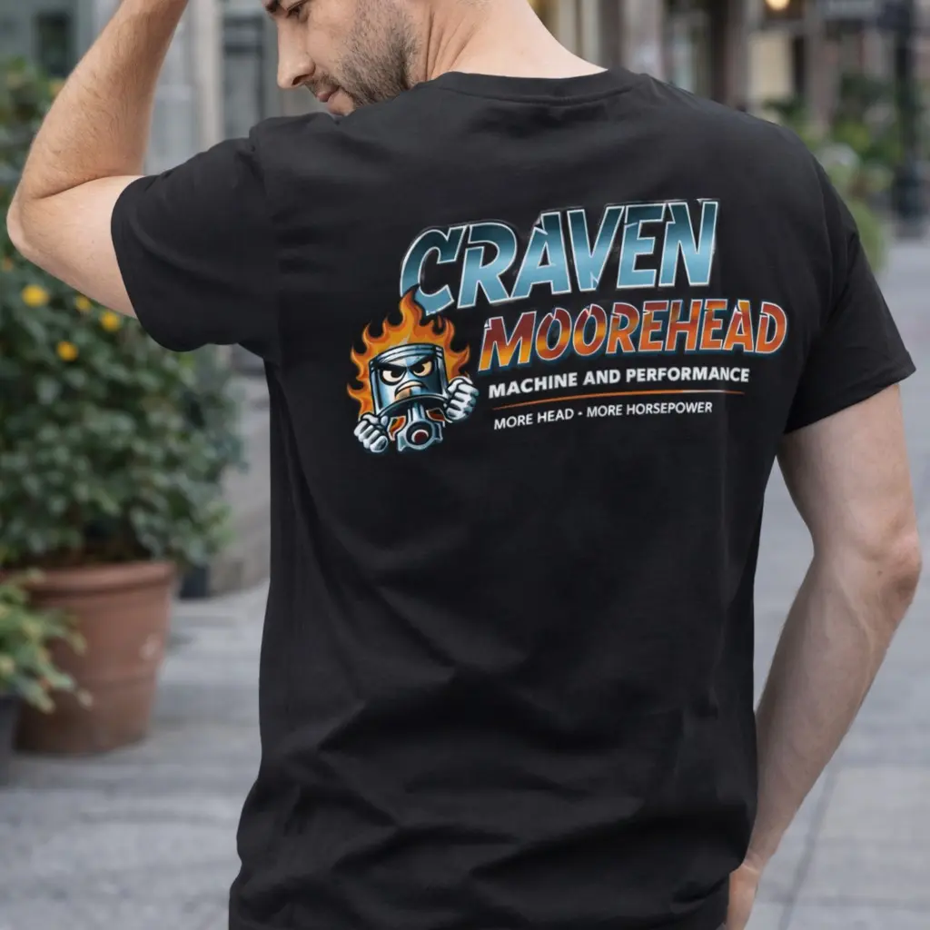 Turn heads and spark laughs with this bold Craven Moorehead Machine and Performance tee, featuring a fiery piston character and retro-inspired lettering that screams classic garage culture. Packed with tongue-in-cheek humor and vintage automotive vibes, this design is perfect for gearheads who appreciate horsepower—and a good joke. Whether you're in the shop or out on the street, this shirt delivers attitude and personality.