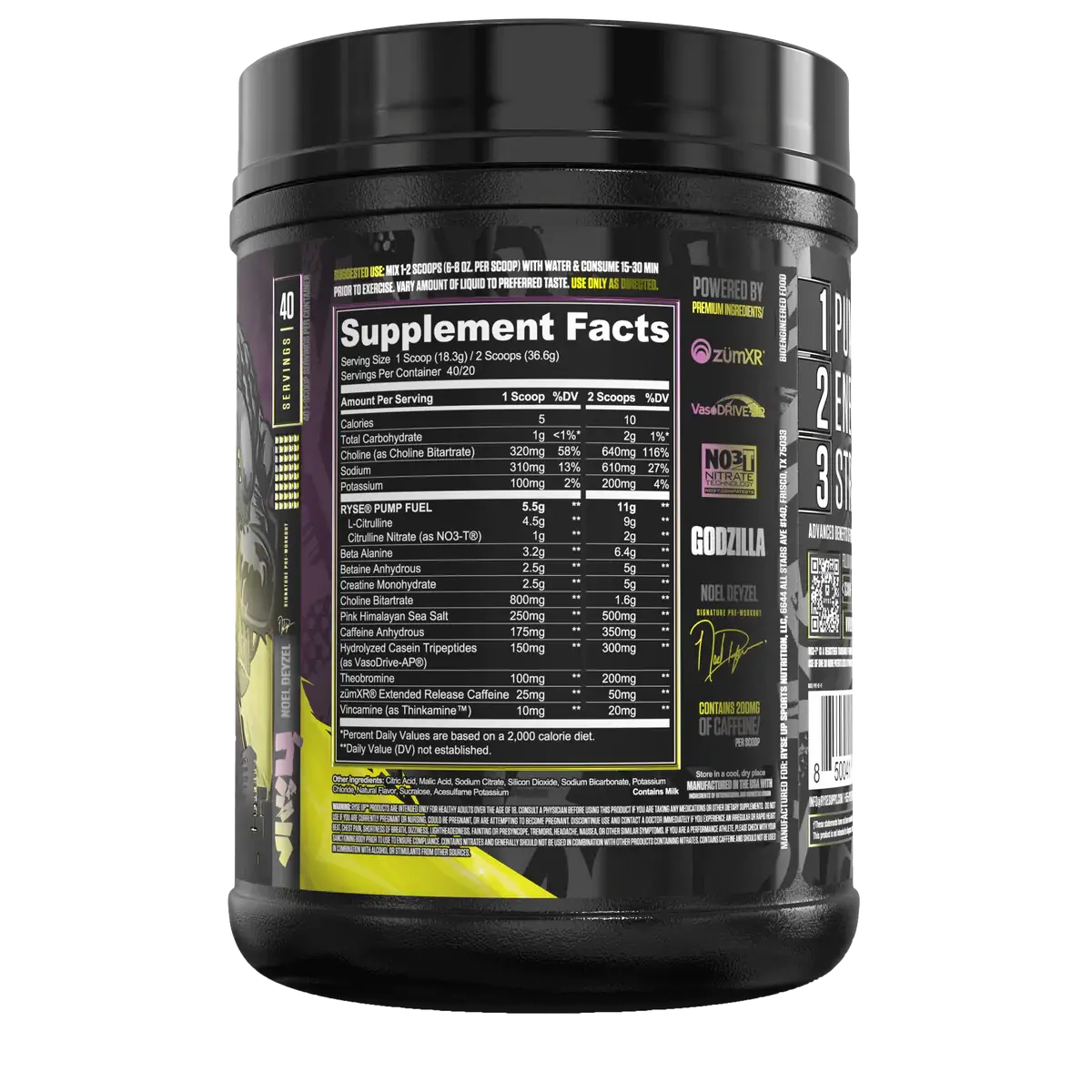 Ryse Godzilla® is an officially licensed pre-workout supplement featuring 40g per serving and 12 key ingredients, including 5 clinically studied trademarked compounds. Formulated with a comprehensive blend of well-researched ingredients, Ryse Godzilla® is designed for fitness enthusiasts who want a complete, high-dosed pre-workout as part of their training routine.